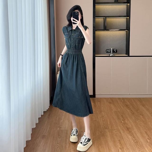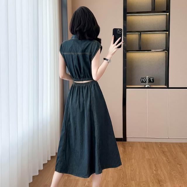 實拍新款法式連衣裙牛仔無袖a字長裙露腰顯瘦港風復古