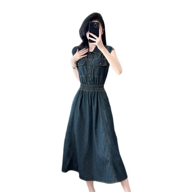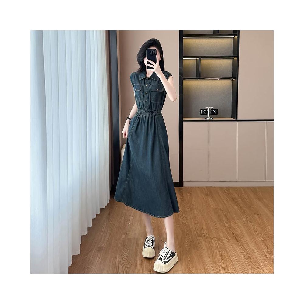 實拍新款法式連衣裙牛仔無袖a字長裙露腰顯瘦港風復古