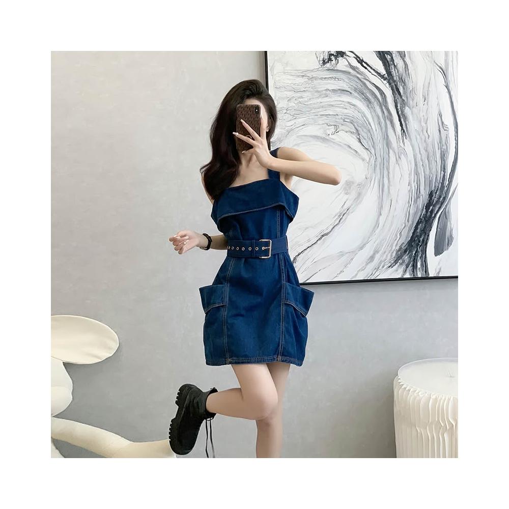 實拍2026夏季新款牛仔連衣裙吊帶裙短裙露肩收腰高腰港風復古