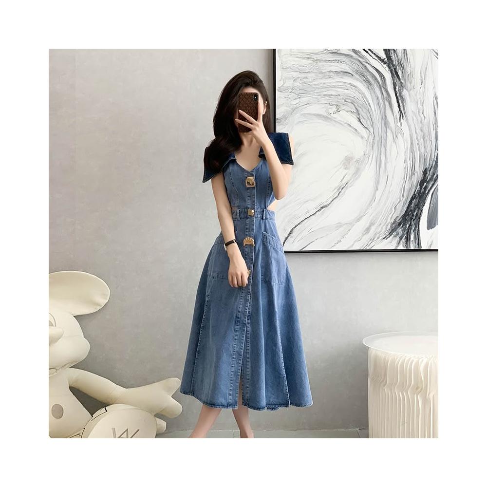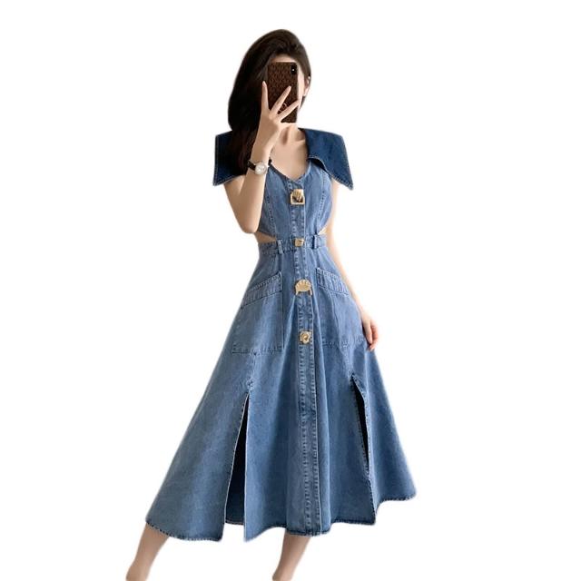 實拍夏季新款露腰高腰顯瘦牛仔連衣裙長裙無袖大擺開叉