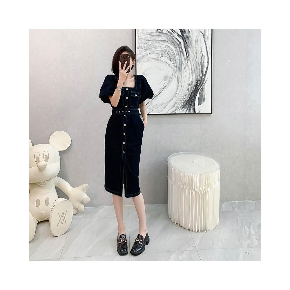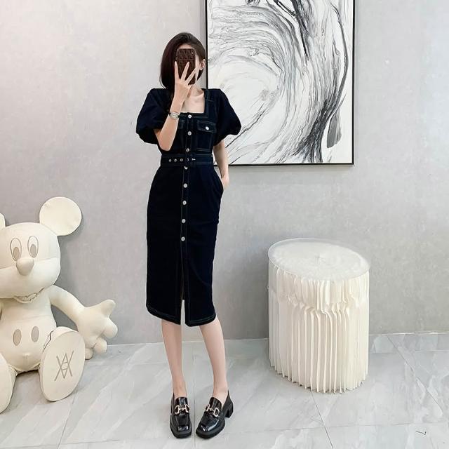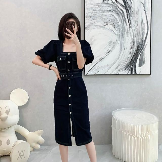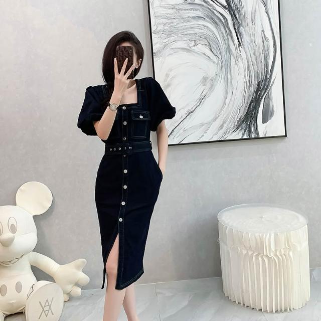 實拍夏季新款牛仔連衣裙短袖中長裙高級感高腰開叉