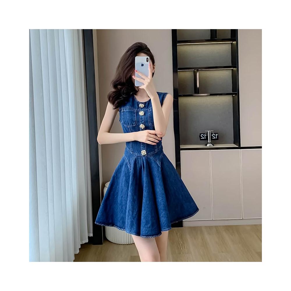 實拍夏季新款牛仔連衣裙短裙無袖百褶裙甜美顯瘦荷葉邊裙