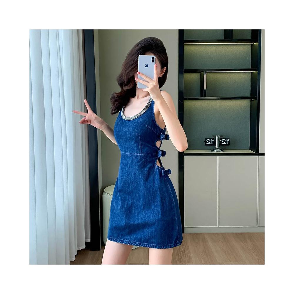實拍夏季新款無袖連衣裙露背圓領露肩短裙露腰簡約辣妹