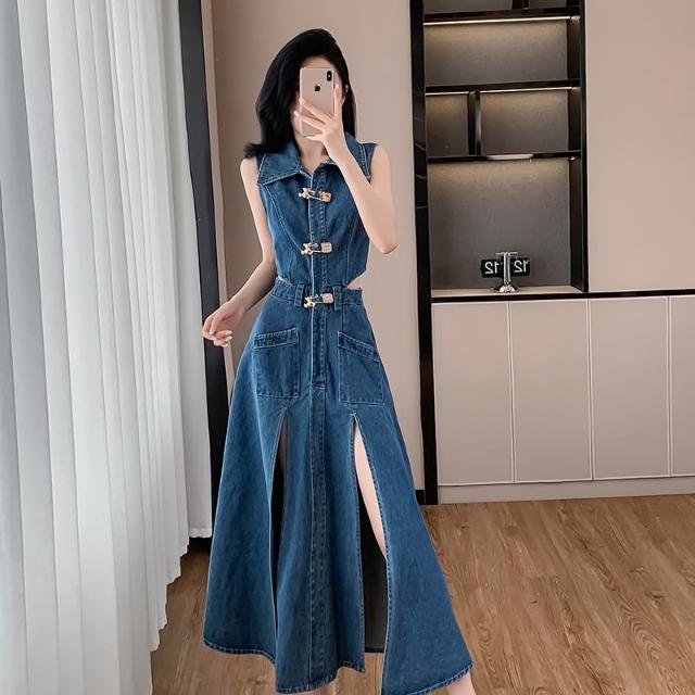 實拍夏季新款牛仔開叉露腰無袖連衣裙中長裙休閑露腿性感