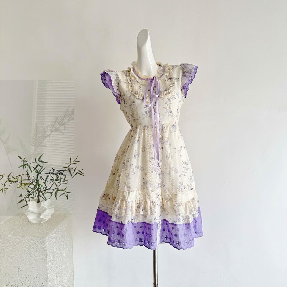 全店免稅 M-CO 慕寇 高級禮服 sinsingirl 紫藤花信 夏季淺紫色碎花小飛袖寬松娃娃感連衣裙裙子