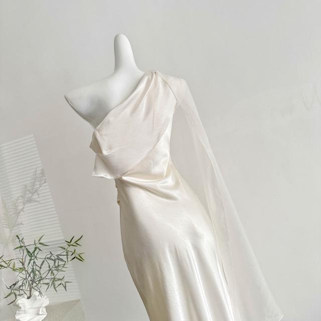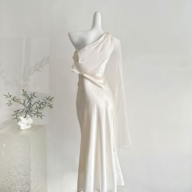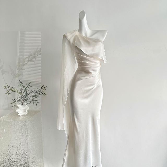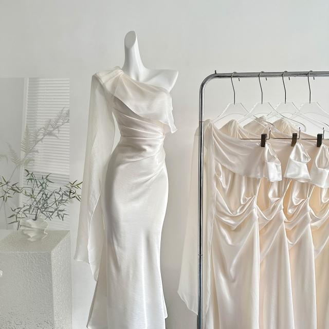 全店免稅 M-CO 慕寇 高級禮服 從一時刻暮光2026新款白色緞面斜肩連衣裙高級感飄帶修身禮服