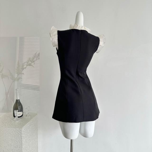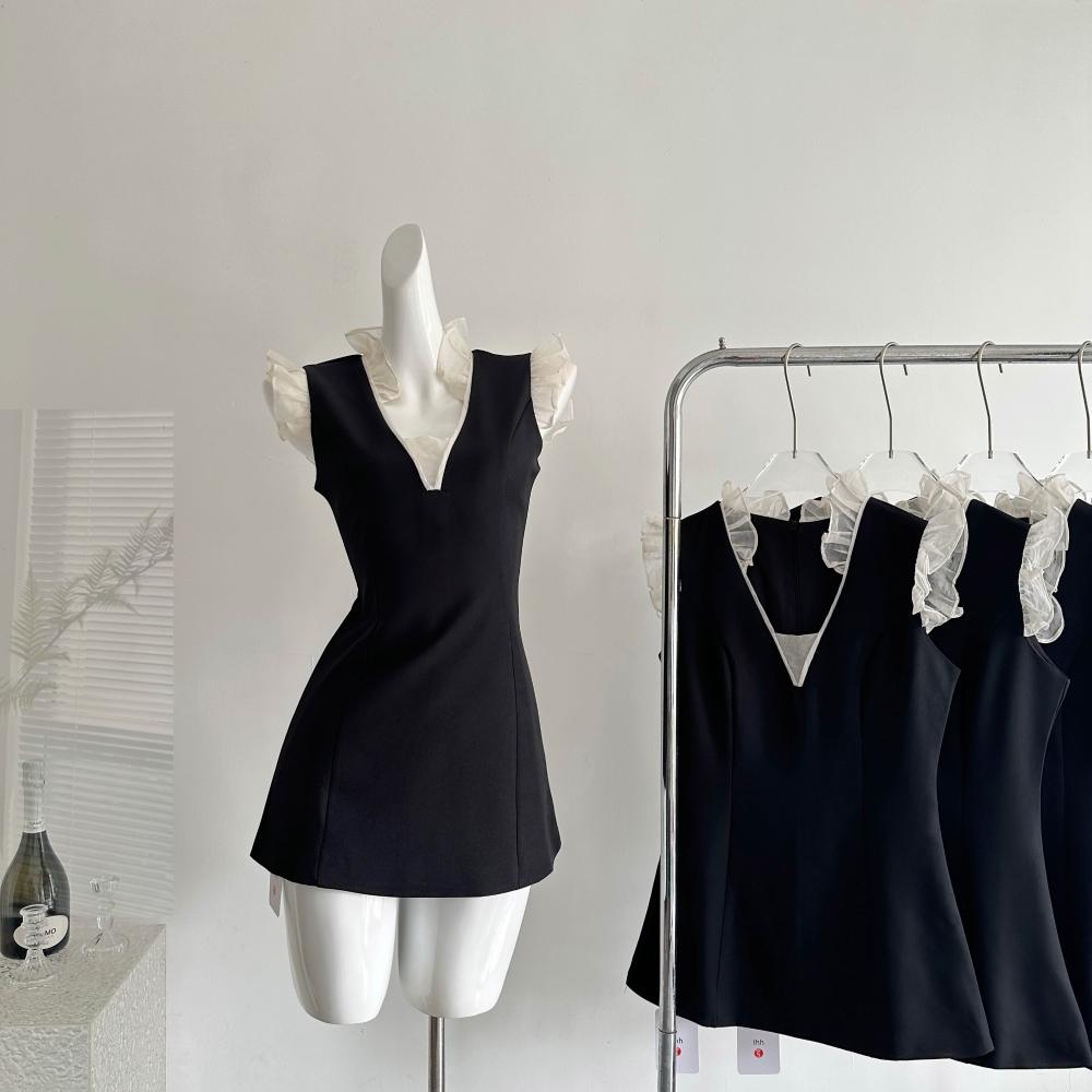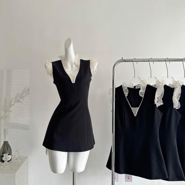 全店免稅 M-CO 慕寇 高級禮服 CHICYOU "羅馬假日" 黑色白立體荷葉領v領收腰顯瘦小禮服連衣裙女