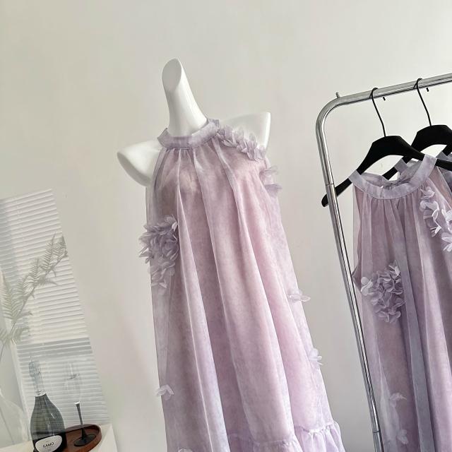 全店免稅 M-CO 慕寇 高級禮服 Lycheerose荔枝肉獨特漂亮絕美紫色無袖掛脖連衣裙女夏度假長裙子