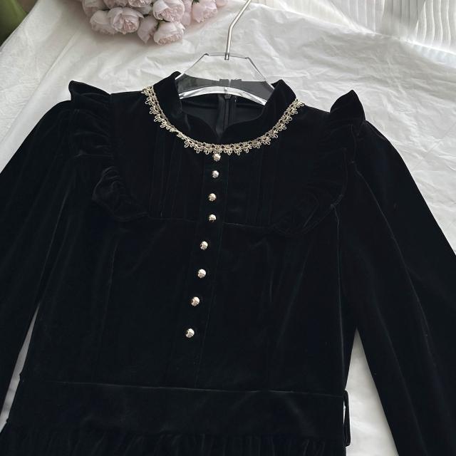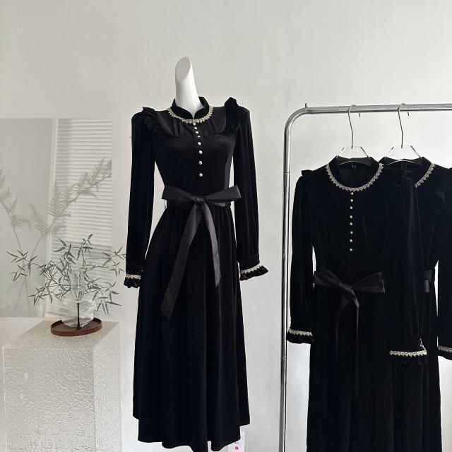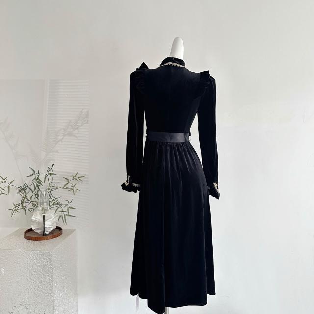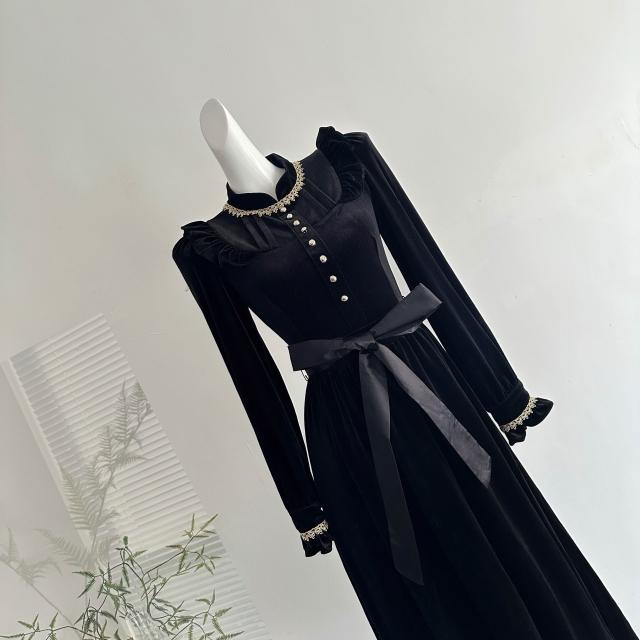 全店免稅 M-CO 慕寇 高級禮服 一生羅曼金色宮殿法式連衣裙女長裙黑色復古新款秋季長袖裙子