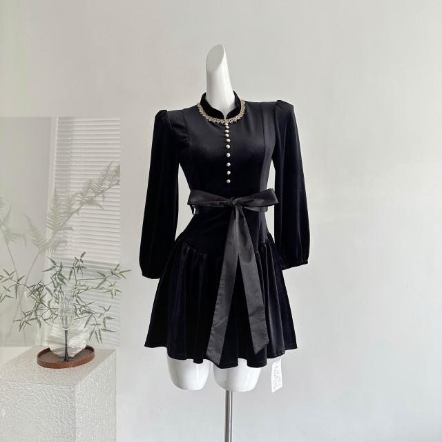 全店免稅 M-CO 慕寇 高級禮服 吃綠色菜伯拉德千金 新品88折赫本風黑色絲絨長袖連衣裙秋季