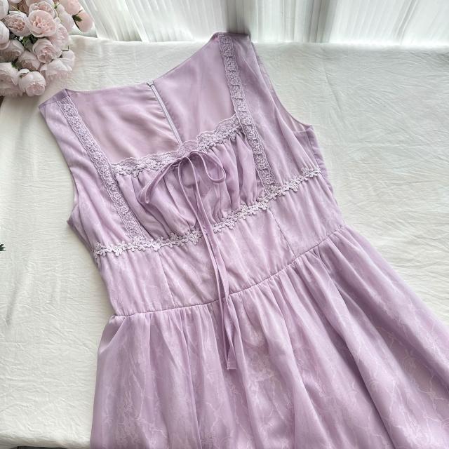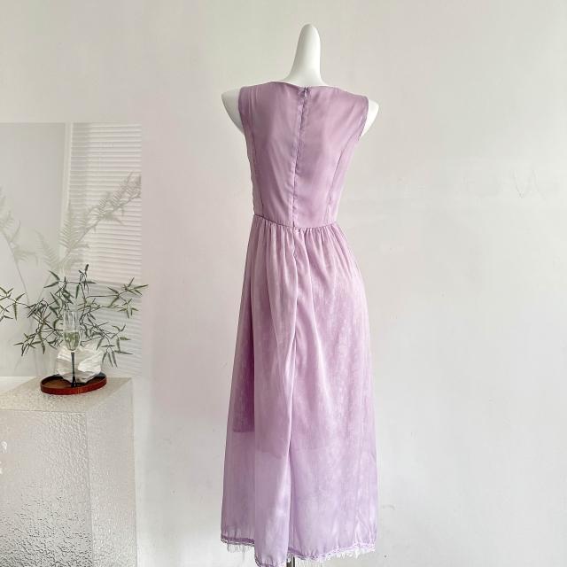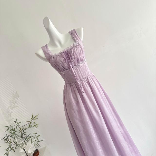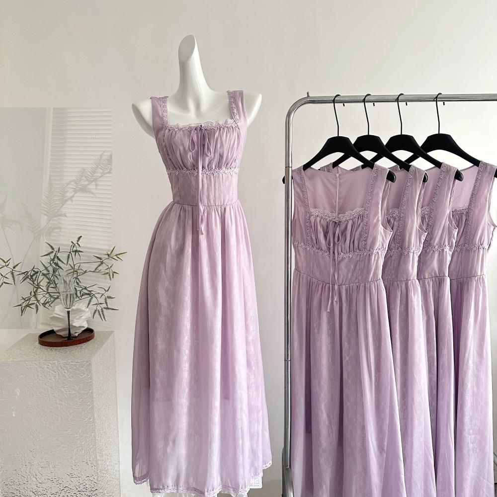 全店免稅 M-CO 慕寇 高級禮服 Acaine紫色長款方領收腰a字吊帶連衣裙女夏季法式復古千金風裙子