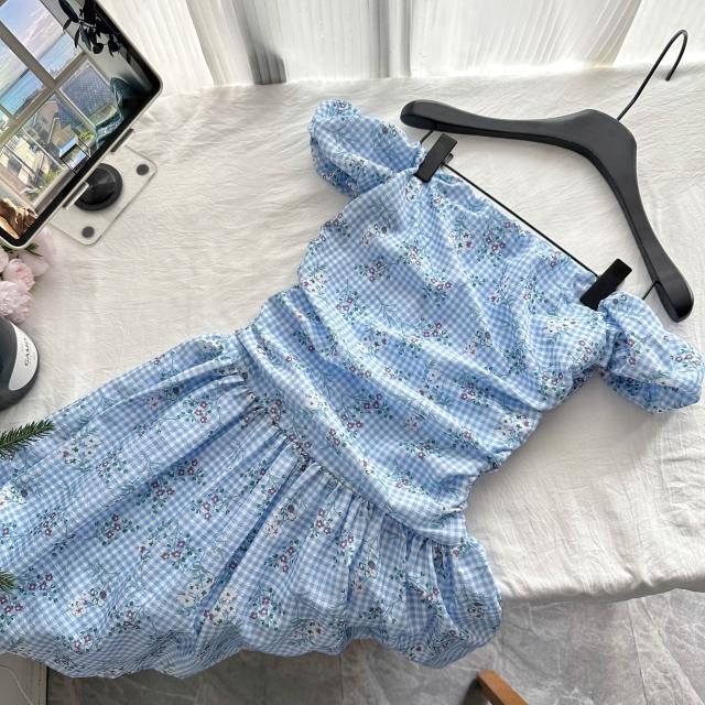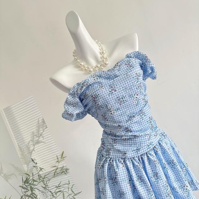 全店免稅 M-CO 慕寇 高級禮服 shareinin 冰河藍 格子紫色小碎花 褶皺一字領連衣裙
