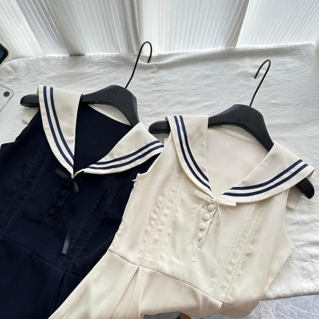 全店免稅 M-CO 慕寇 高級禮服 遲傘傘 25/ss 初訪六本木 海軍領棉質木耳邊無袖連衣裙米白/藏青