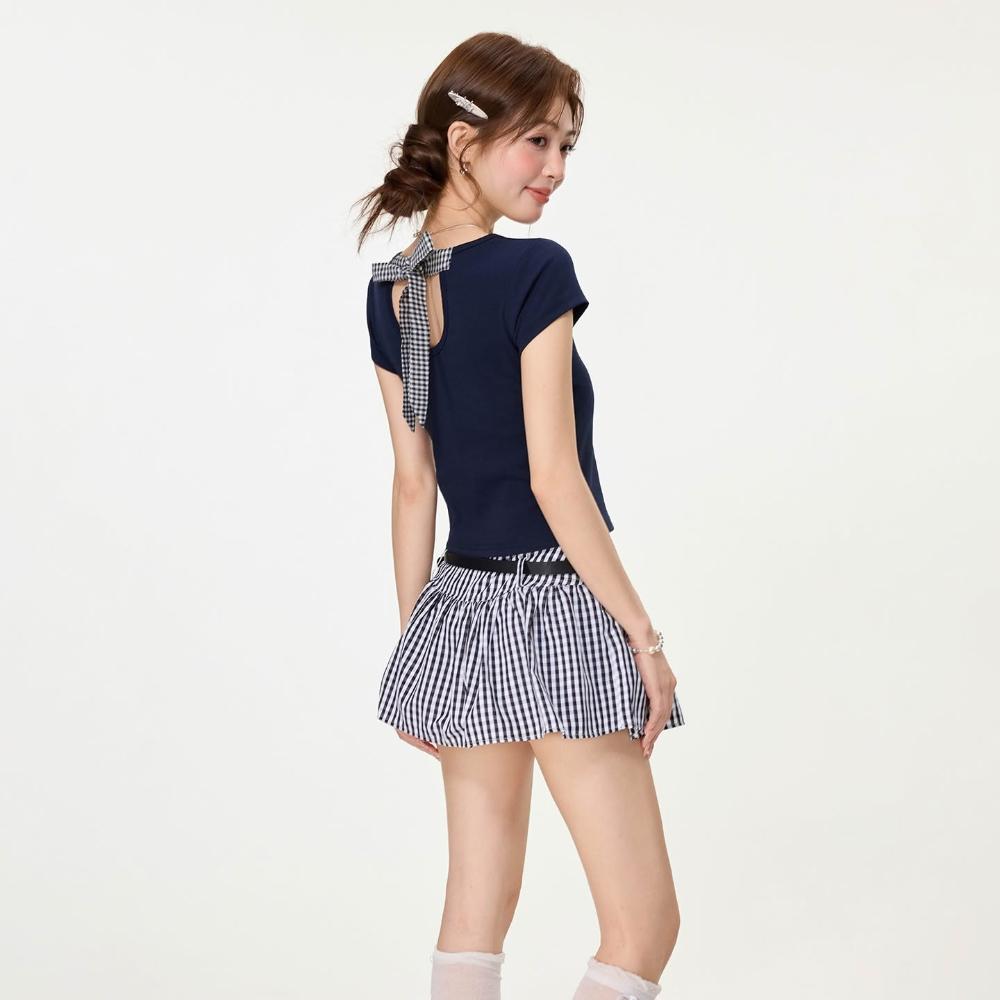實拍實價藏藍蝴蝶結綁帶正肩短袖t恤女夏季镂空辣妹修身短款上衣 媽媽裝 M-COCO 慕寇