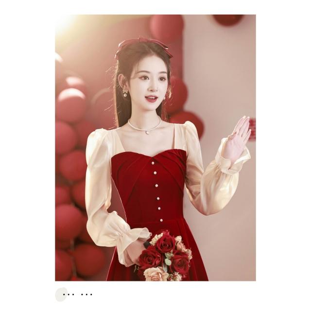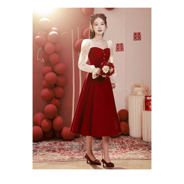 敬酒服新娘酒紅色小個子結婚禮服訂婚連衣裙長袖平時可穿回門衣服 M-C 全店免運免稅