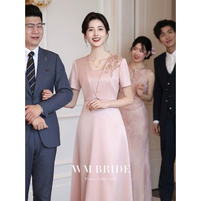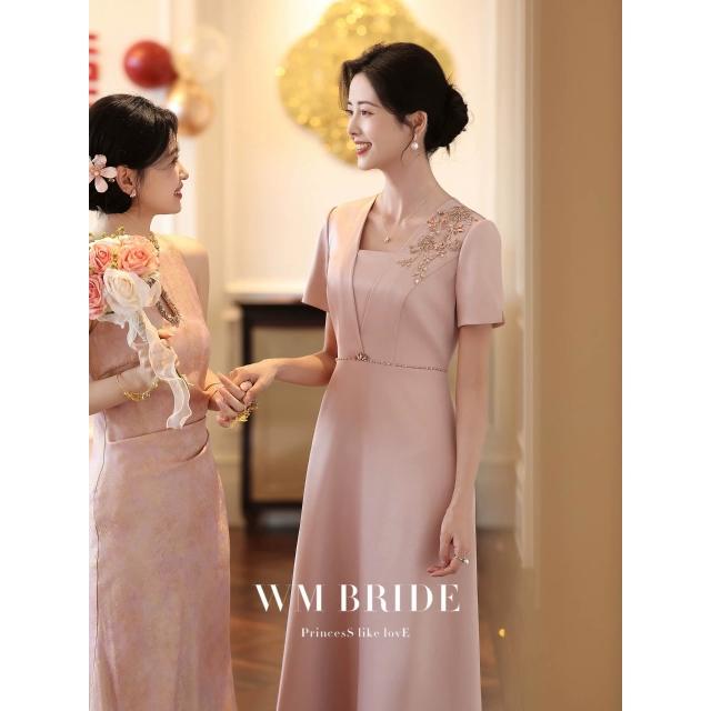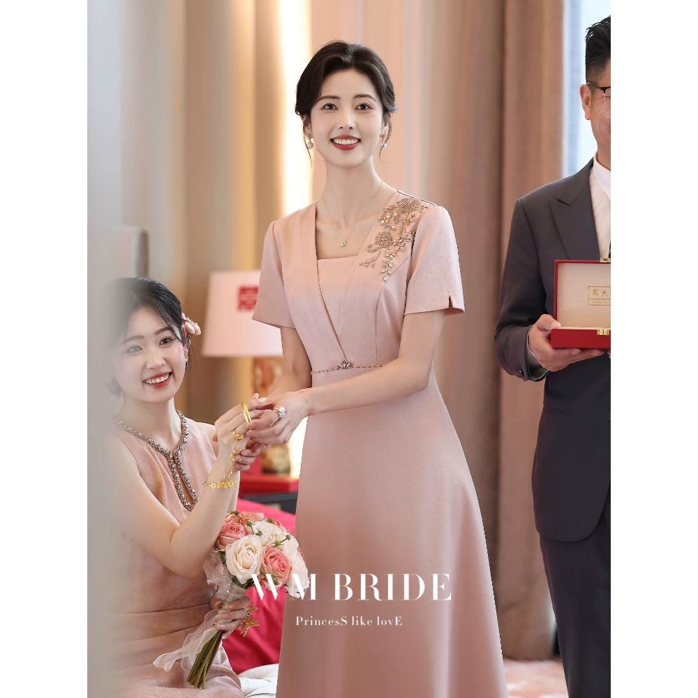 粉色媽媽婚宴禮服高貴年輕2026新款氣質喜婆婆禮服顯瘦高端連衣裙 M-C 全店免運免稅