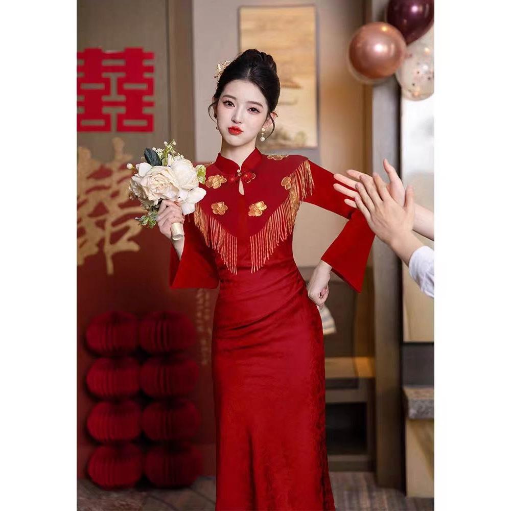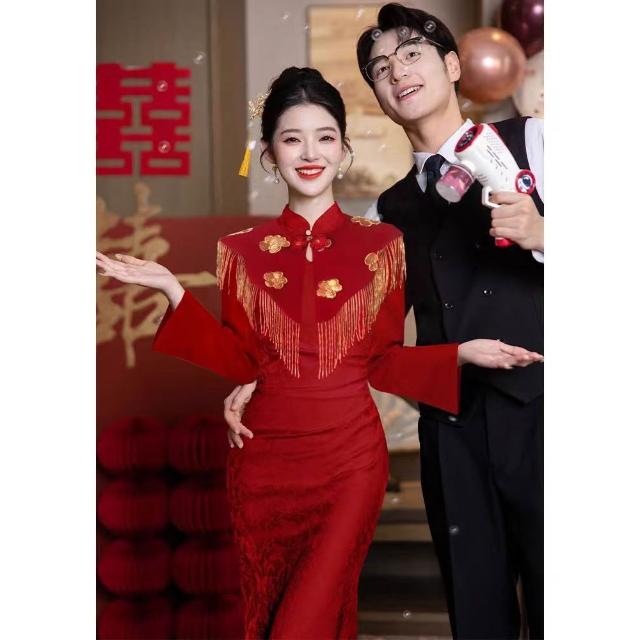 中式高端輕奢流蘇披肩紅色旗袍敬酒服長袖新娘連衣裙回門訂婚禮服 M-C 全店免運免稅