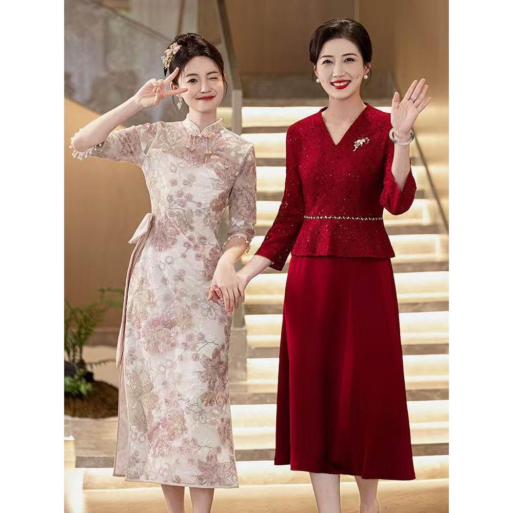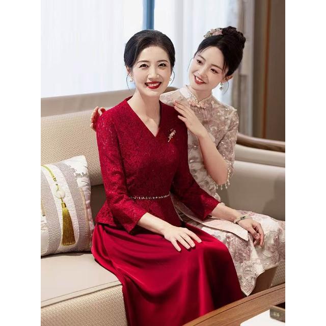 十月喜婆婆婚宴裝新中式連衣裙婚禮結婚禮服媽媽喜服蕾絲長袖春秋 M-C 全店免運免稅