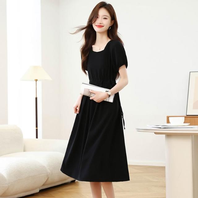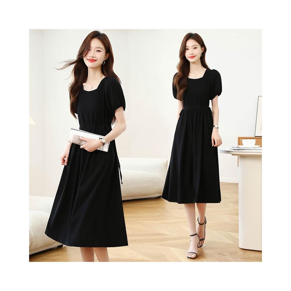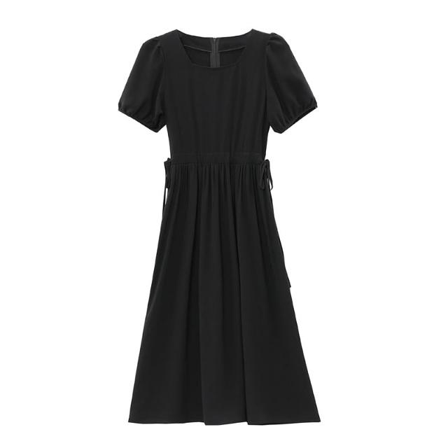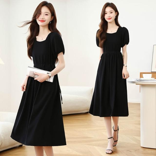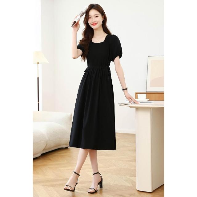 實拍赫本風法式方領黑色連衣裙女夏季高級感收腰氣質中長款裙子新 M-C 全店免運免稅