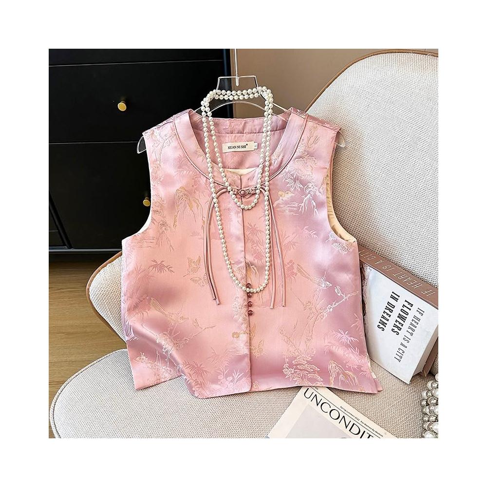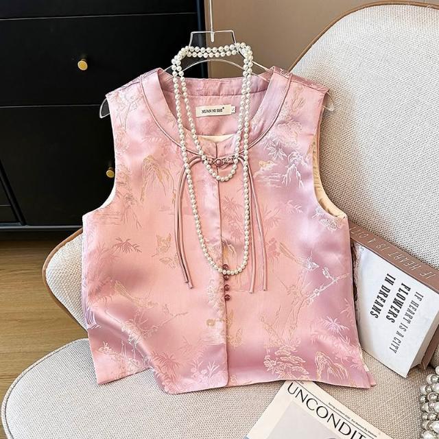 梅鵲影 新中式馬甲春夏原創國風茶服粉色盤扣提花上衣 M-C 全店免運免稅