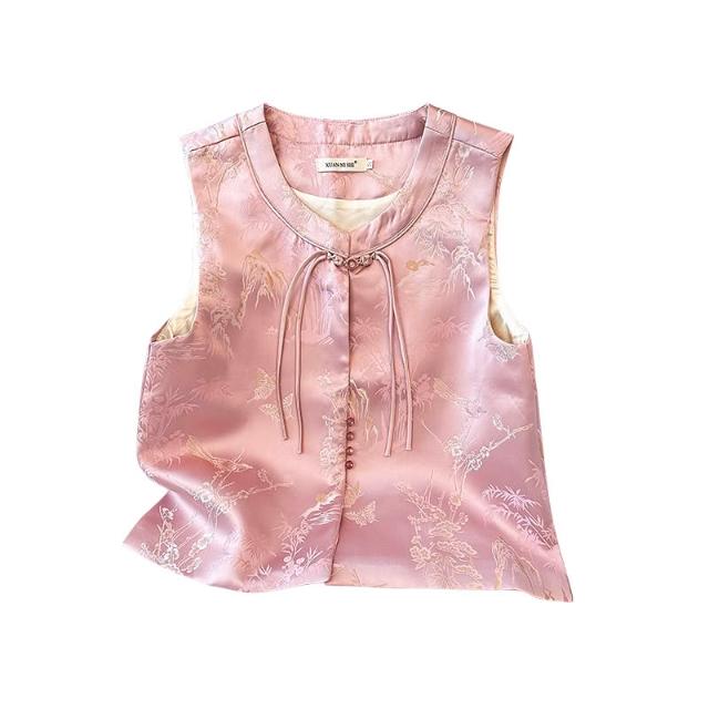 梅鵲影 新中式馬甲春夏原創國風茶服粉色盤扣提花上衣 M-C 全店免運免稅