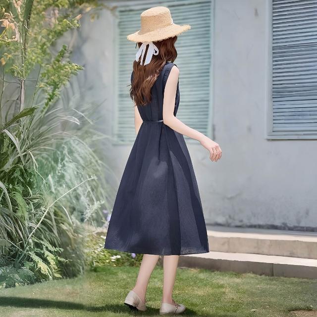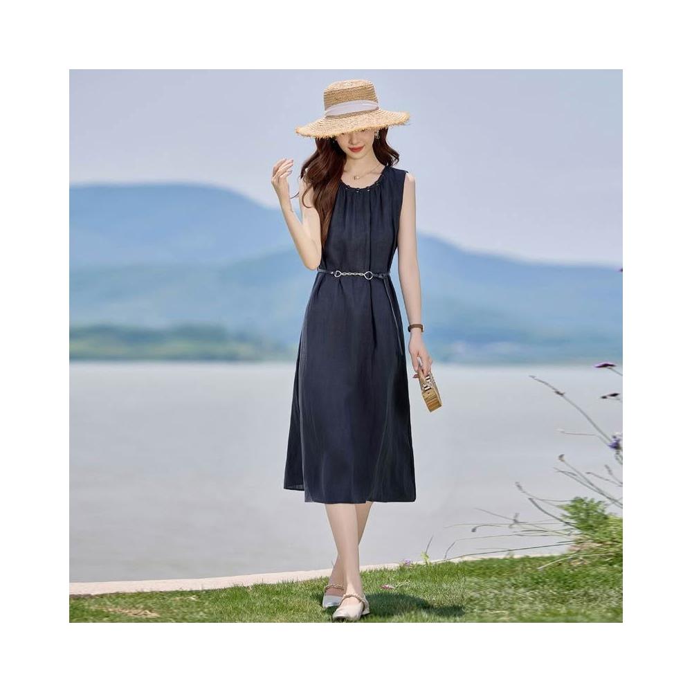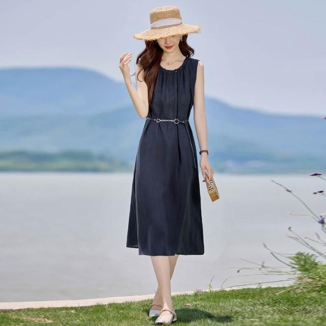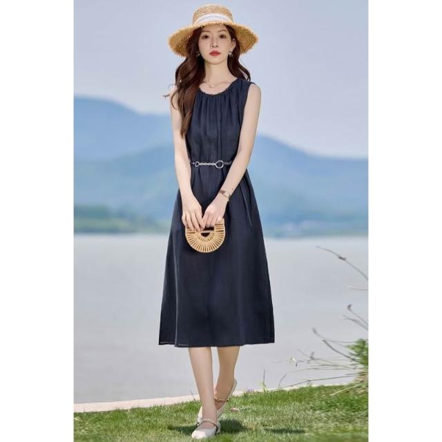法式氣質無袖亞麻連衣裙女2026夏季新款系帶收腰顯瘦巨好看背心裙 M-C 全店免運免稅