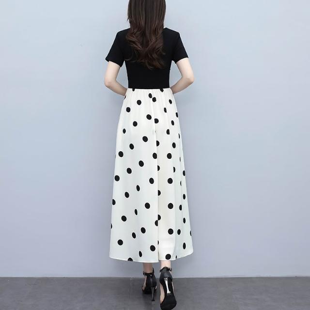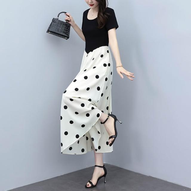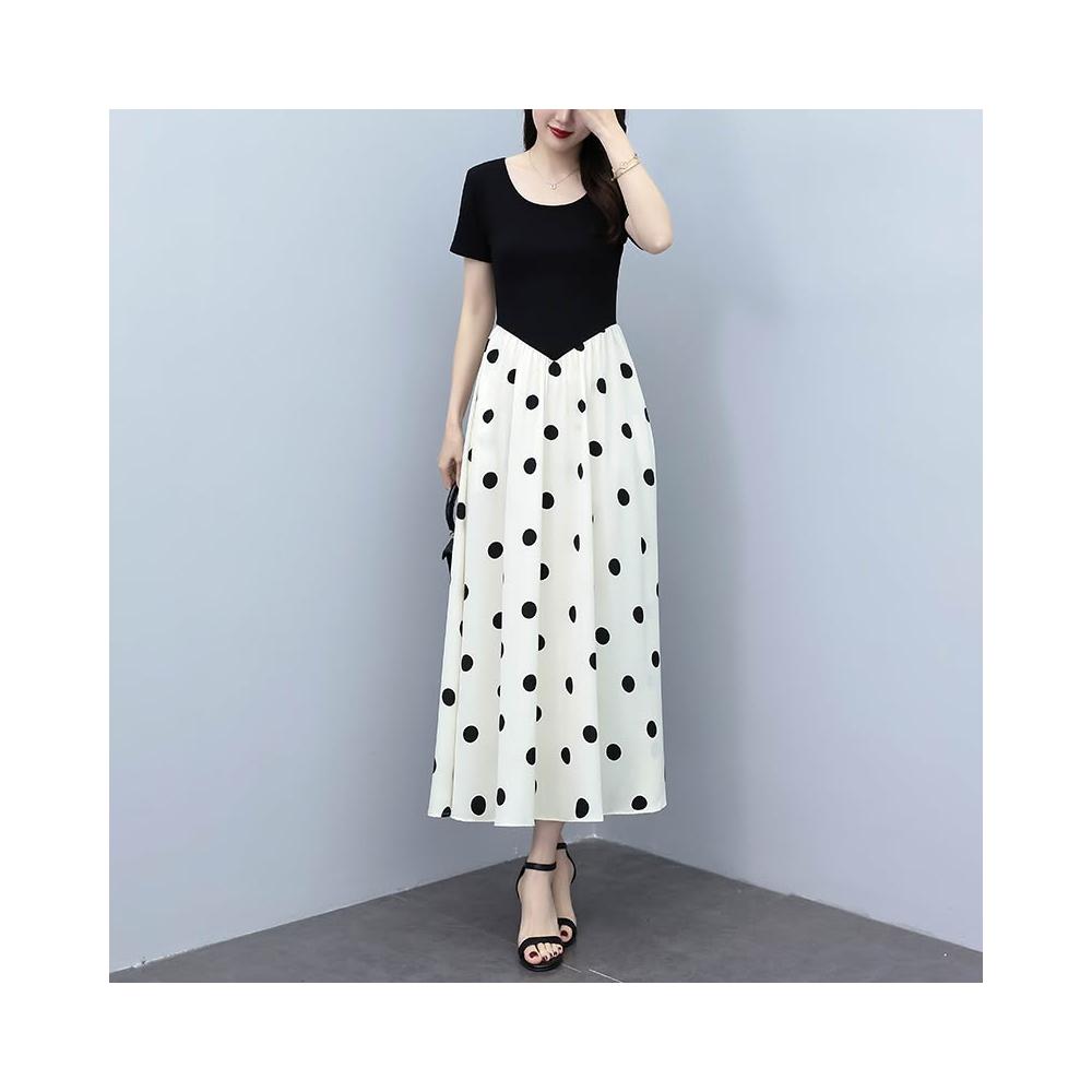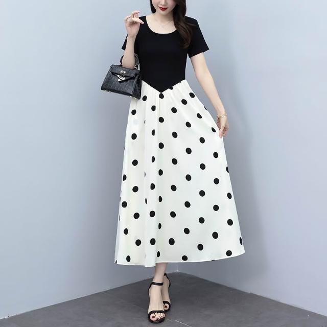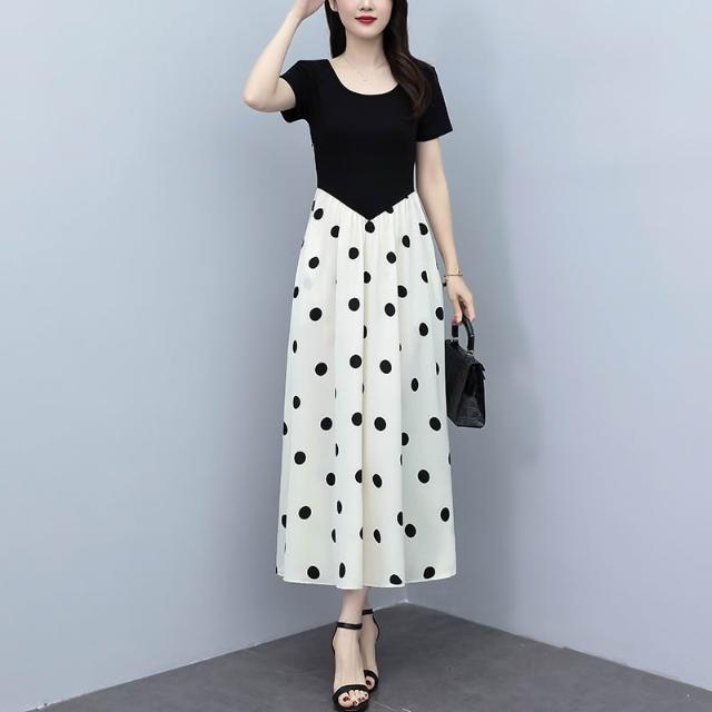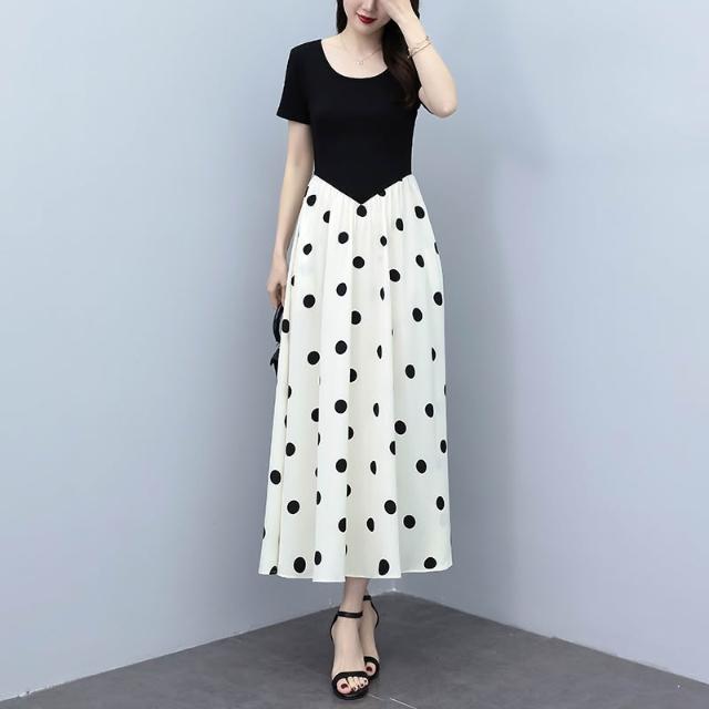 廣州十三行連衣裙夏季新款爆款大碼氣質顯瘦假兩件拼接波點長裙子 M-C 全店免運免稅