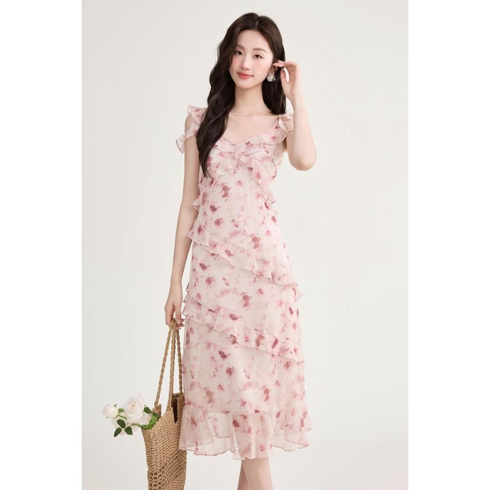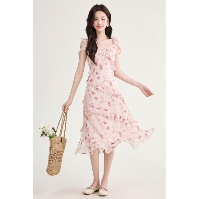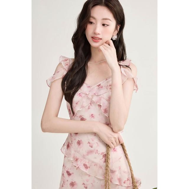 靈動荷葉 法式碎花吊帶連衣裙女小個子仙氣裙粉色裙子夏 M-C 全店免運免稅
