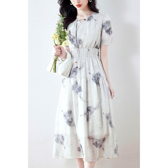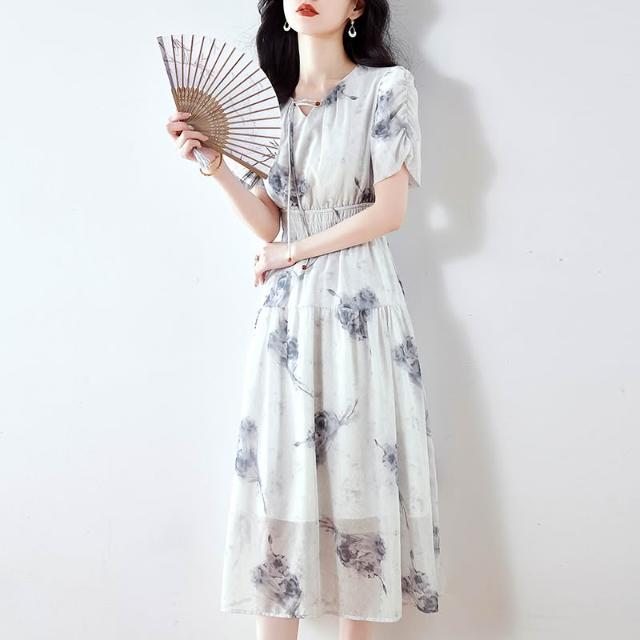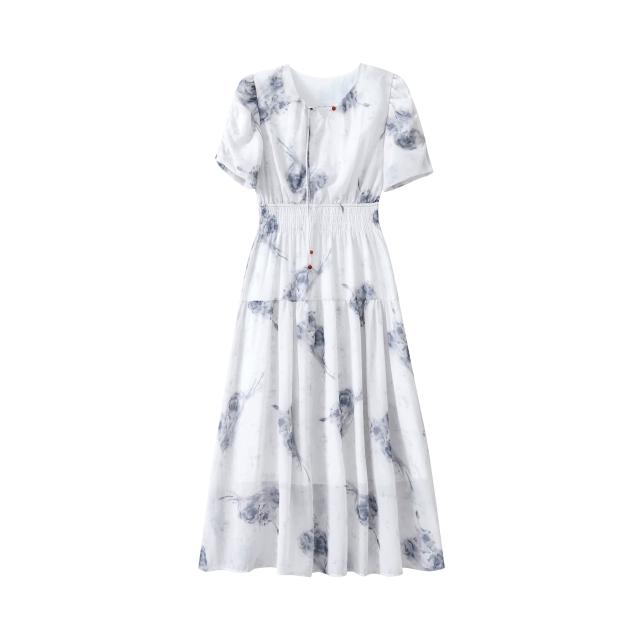 實拍水墨畫連衣裙女2025新款夏季高級感法式收腰氣質V領雪紡裙子 M-C 全店免運免稅