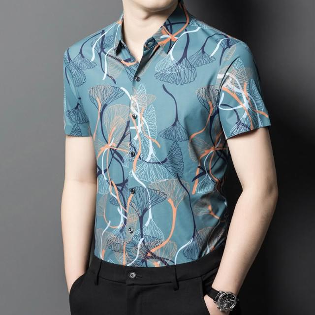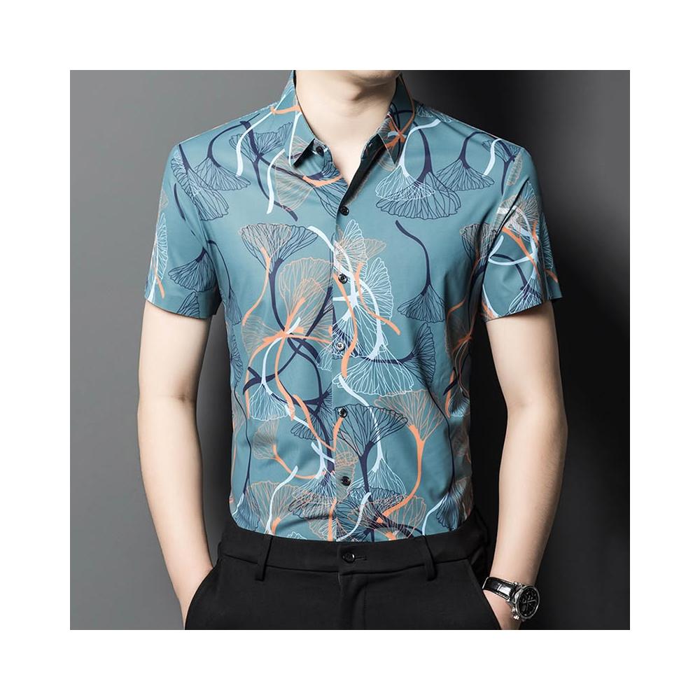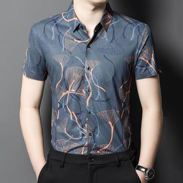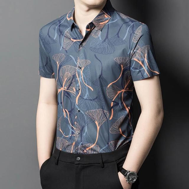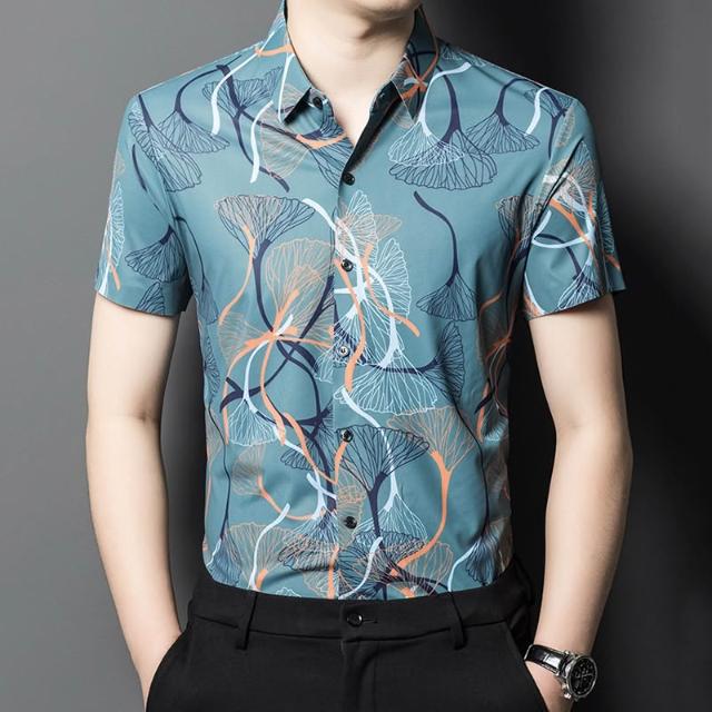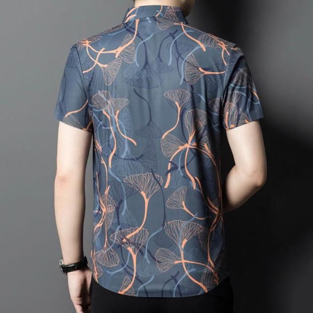 夏季男士亞桑蠶絲短袖襯衫男商務休閑碎花高級感冰絲襯衣爸爸裝 【威登尼男装】