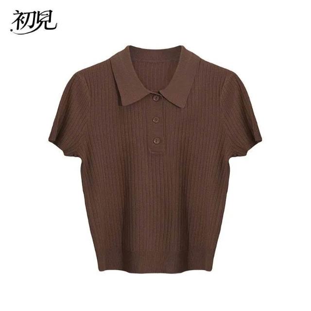 初見POLO衫 短袖T恤 亞麻上衣 純棉上衣 真絲上衣 女裝夏季polo翻領短包袖針織衫學院風短款顯瘦上衣小個子