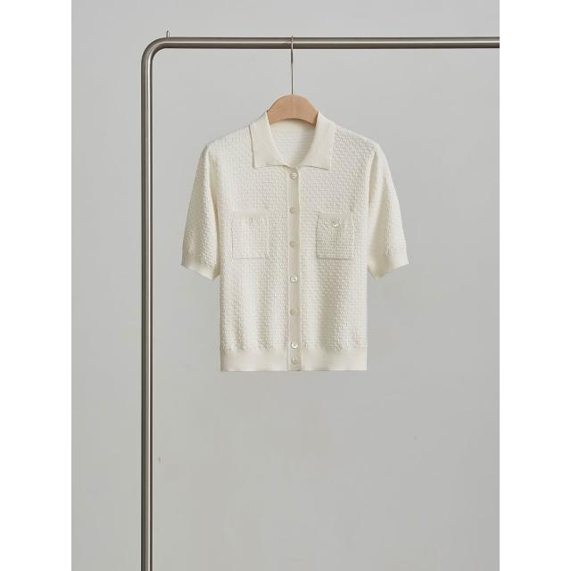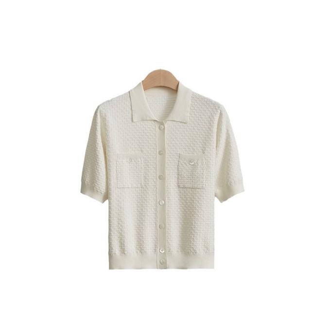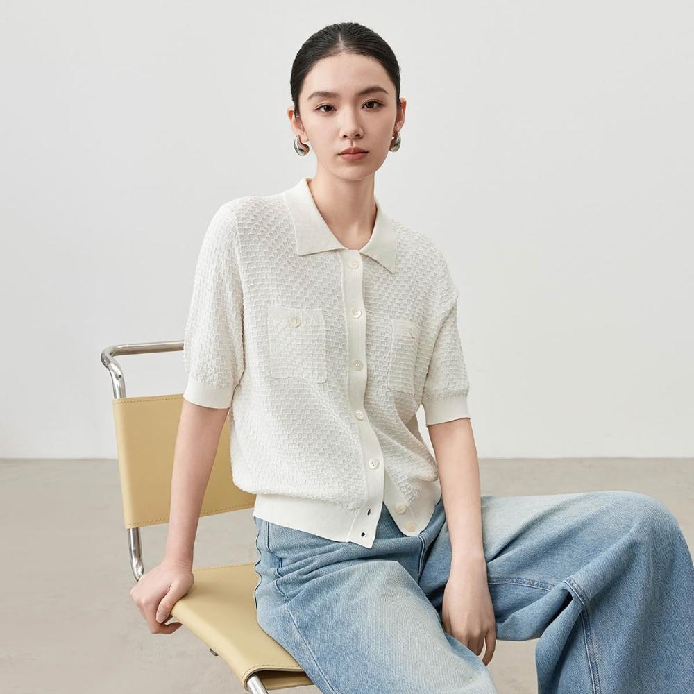 初見POLO衫 短袖T恤 亞麻上衣 純棉上衣 真絲上衣 桑蠶絲針織純色打底衫中袖镂空打底短袖開衫簡約時尚真絲襯衫
