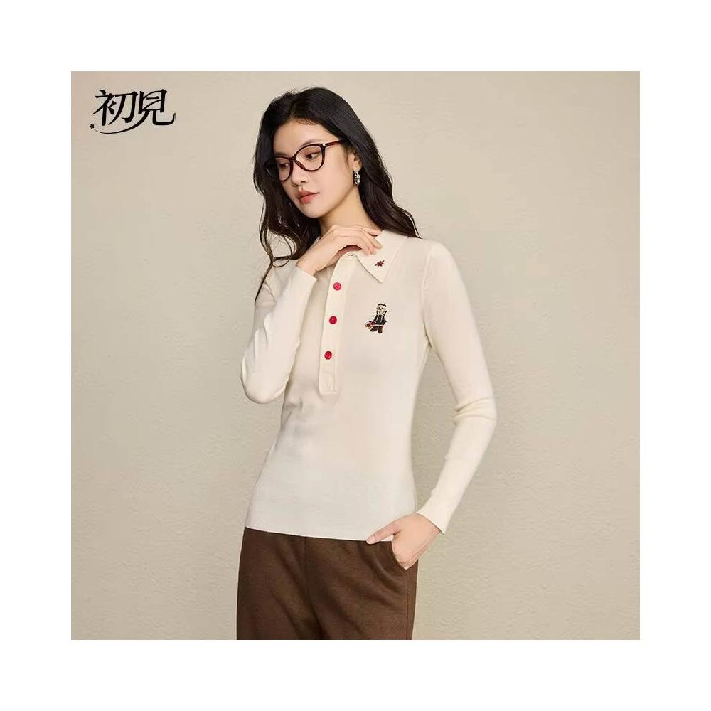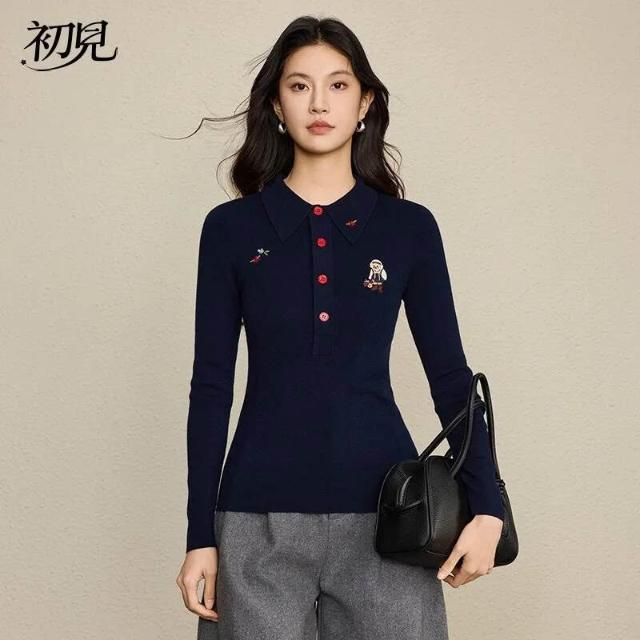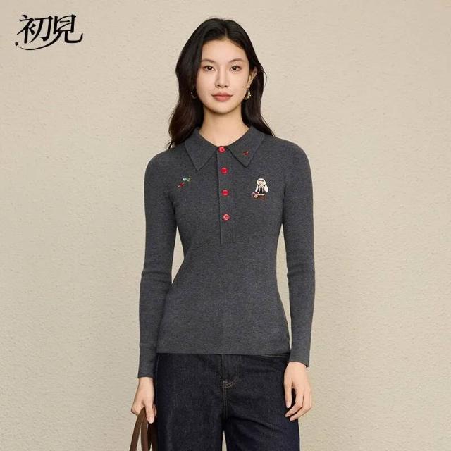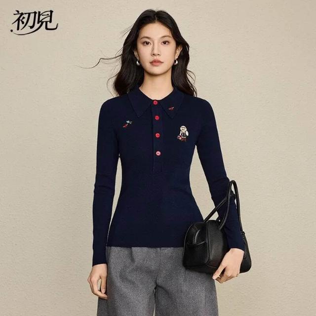 初見POLO衫 短袖T恤 亞麻上衣 純棉上衣 真絲上衣 小熊刺繡復古英氣POLO衫女 羊毛混紡休閑毛衣針織衫女裝上衣長袖