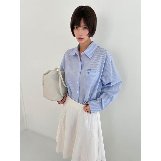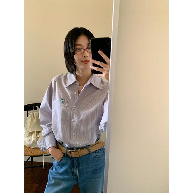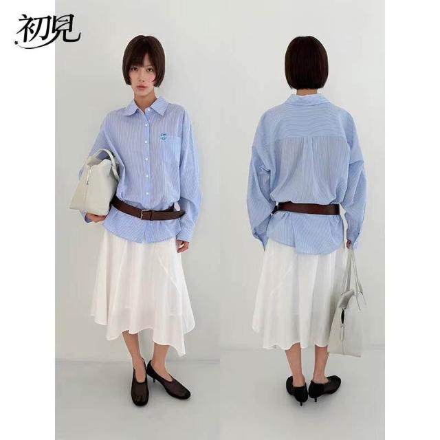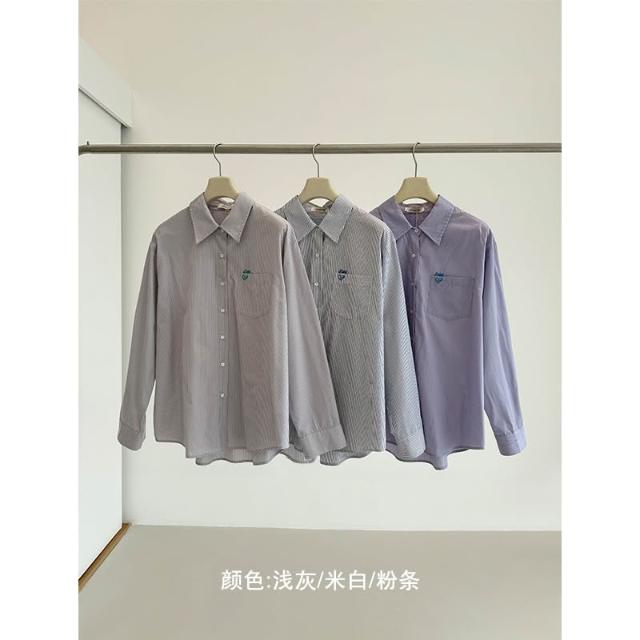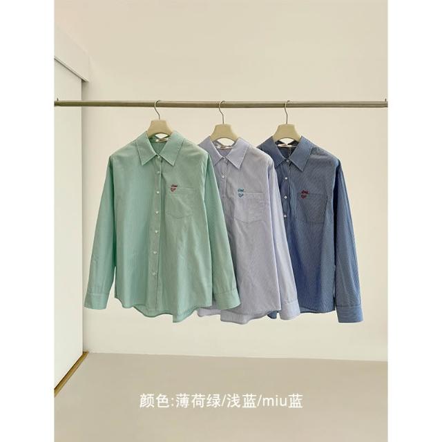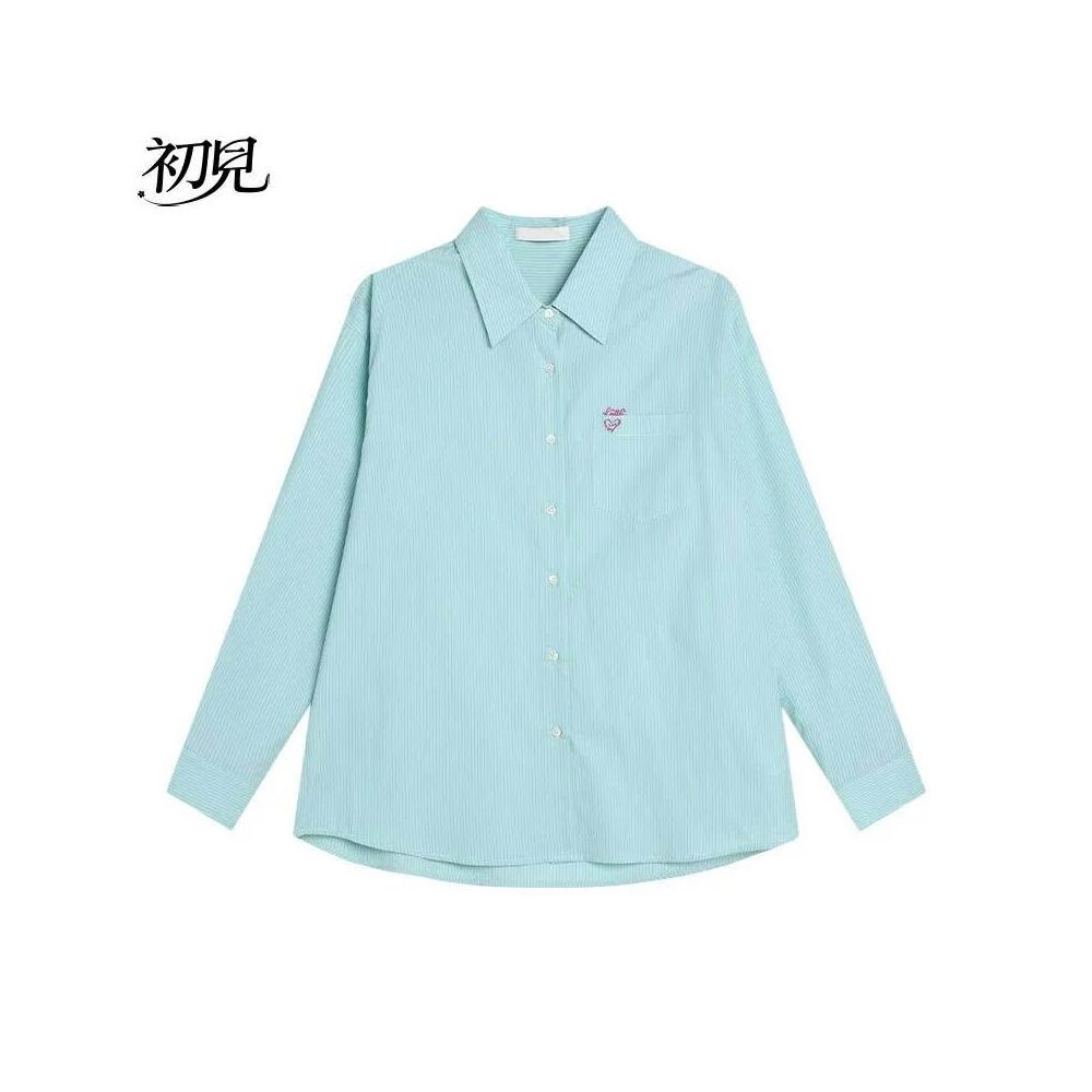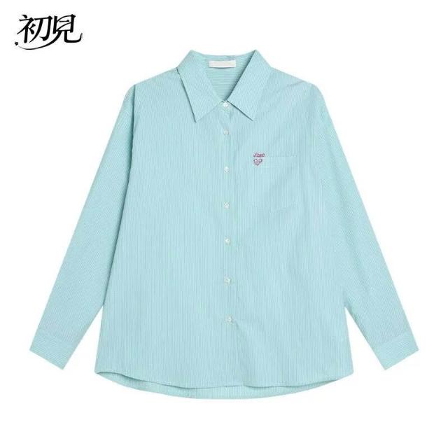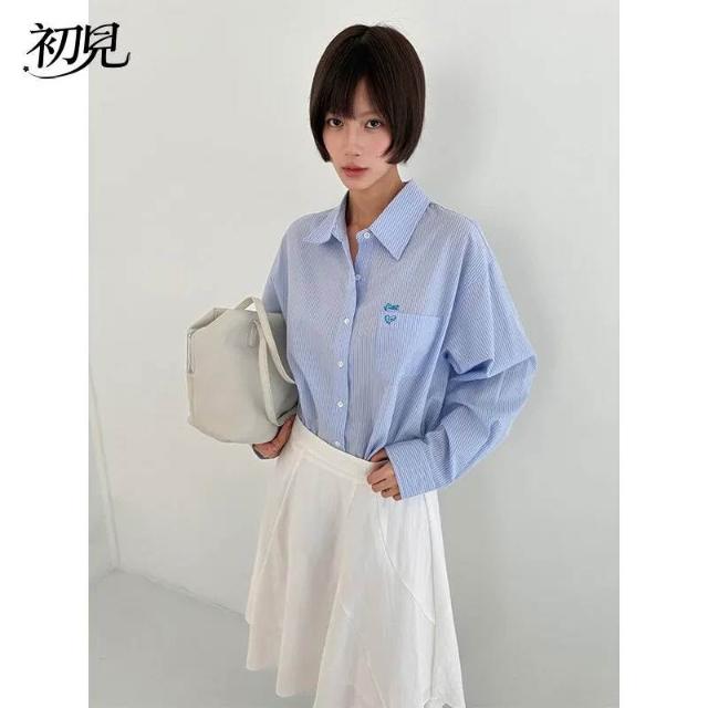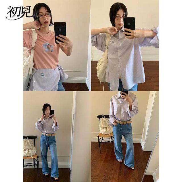 初見POLO衫 短袖T恤 亞麻上衣 純棉上衣 真絲上衣 時髦百搭條紋翻領刺繡襯衫女新款百搭通勤襯衣