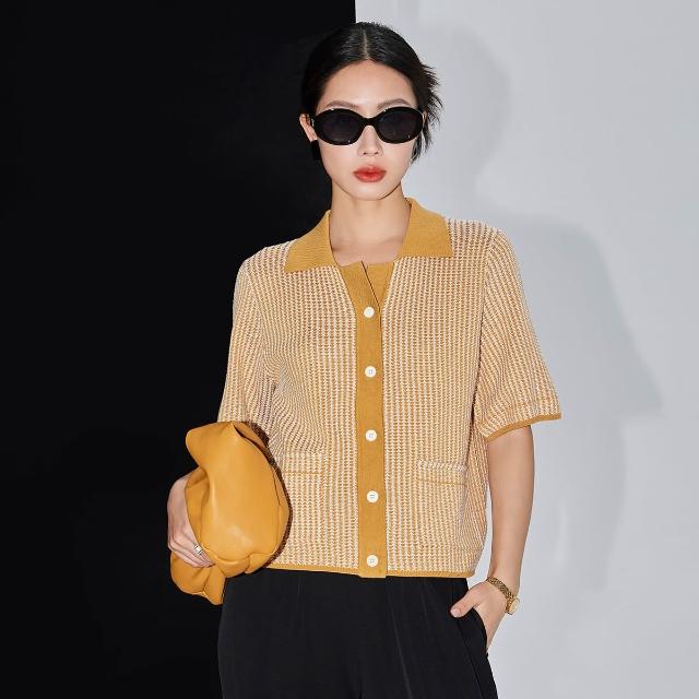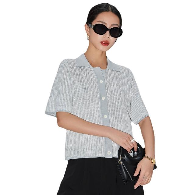 初見POLO衫 短袖T恤 亞麻上衣 純棉上衣 真絲上衣 高品質女裝桑蠶絲針織條紋肌理簡約提花短袖開衫通勤polo領套衫