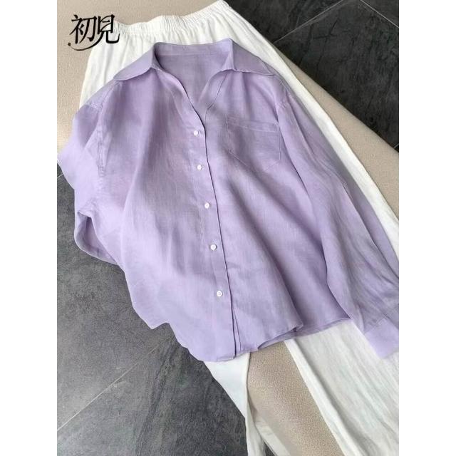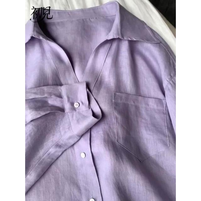 初見POLO衫 短袖T恤 亞麻上衣 純棉上衣 真絲上衣 CHAO級推薦!淺紫色V領亞麻襯衫女夏季新款polo領寬松防曬衫上衣