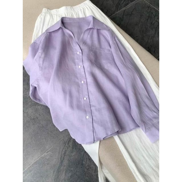 初見POLO衫 短袖T恤 亞麻上衣 純棉上衣 真絲上衣 CHAO級推薦!淺紫色V領亞麻襯衫女夏季新款polo領寬松防曬衫上衣