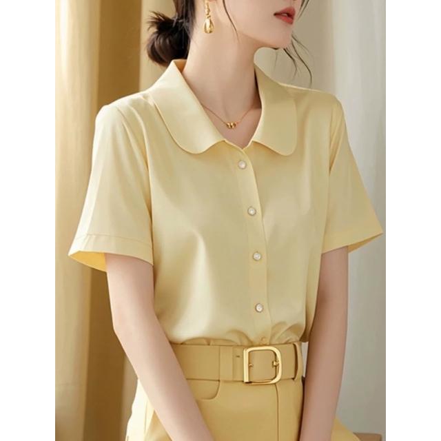 初見POLO衫 短袖T恤 亞麻上衣 純棉上衣 真絲上衣 韓系chic百搭簡約黃色POLO領短袖襯衫女夏季新款洋氣好看修身上衣