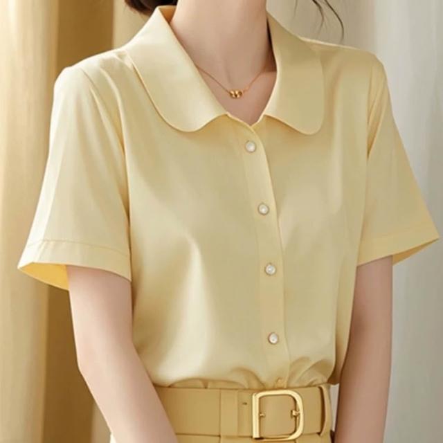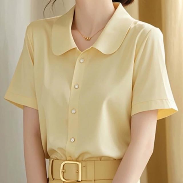 初見POLO衫 短袖T恤 亞麻上衣 純棉上衣 真絲上衣 韓系chic百搭簡約黃色POLO領短袖襯衫女夏季新款洋氣好看修身上衣