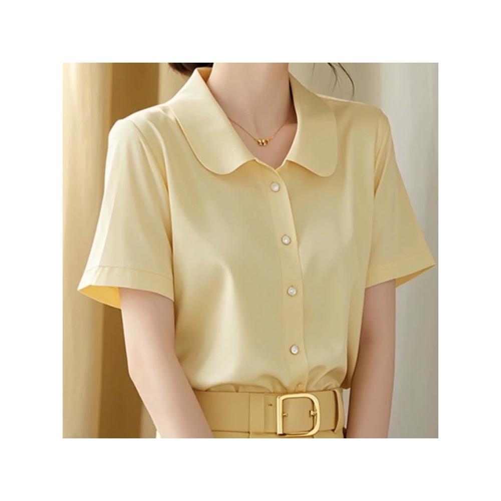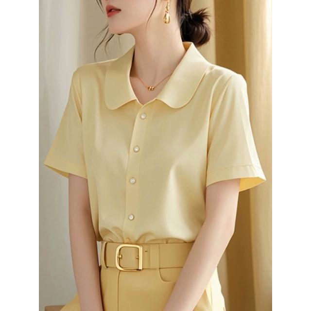 初見POLO衫 短袖T恤 亞麻上衣 純棉上衣 真絲上衣 韓系chic百搭簡約黃色POLO領短袖襯衫女夏季新款洋氣好看修身上衣