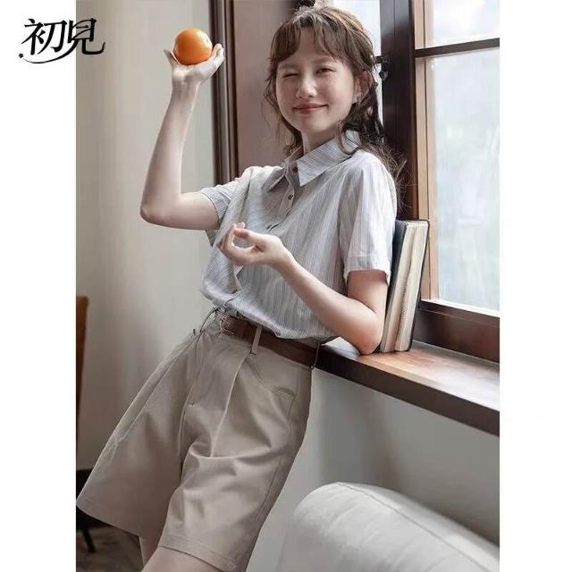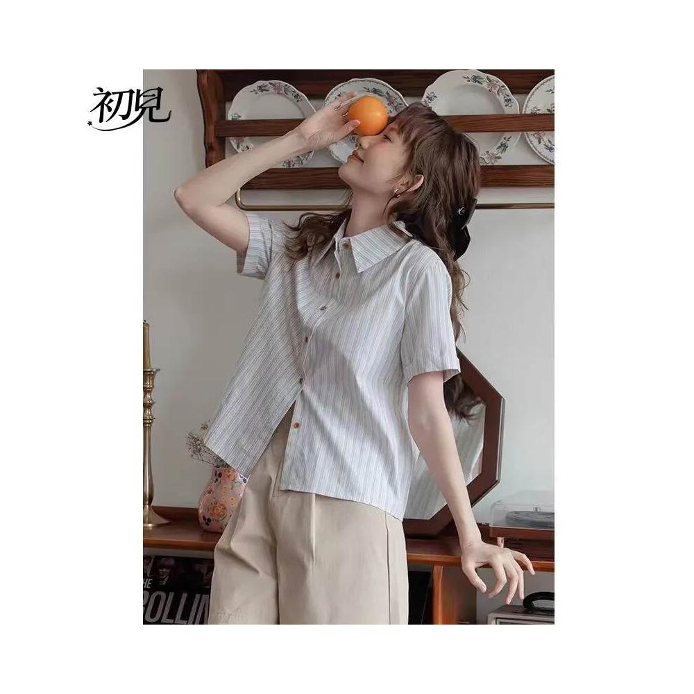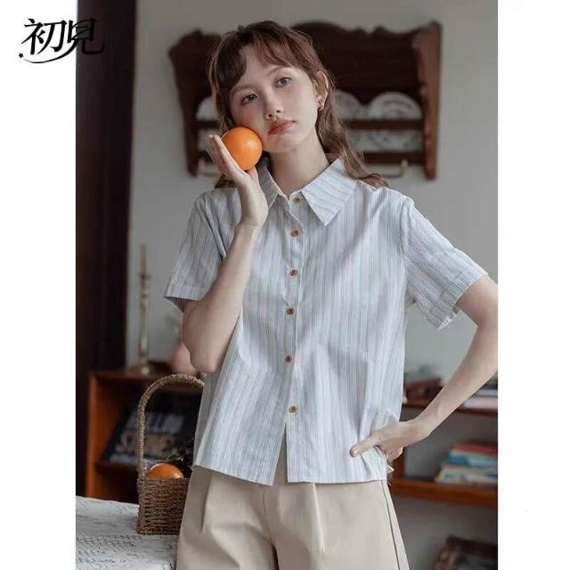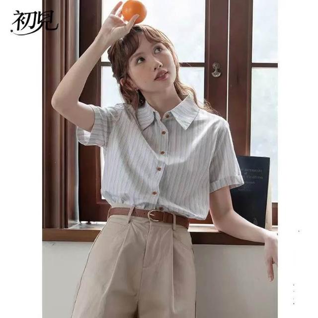 初見 短袖T恤 亞麻上衣 純棉T恤 真絲上衣 學院風條紋短袖襯衫女夏季新款法式別致上衣