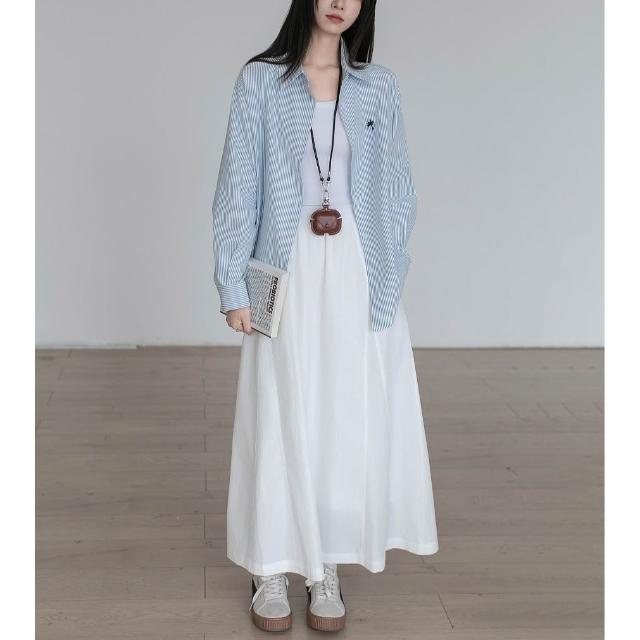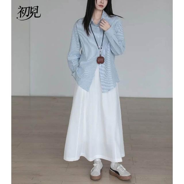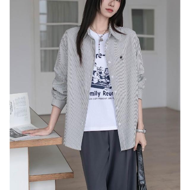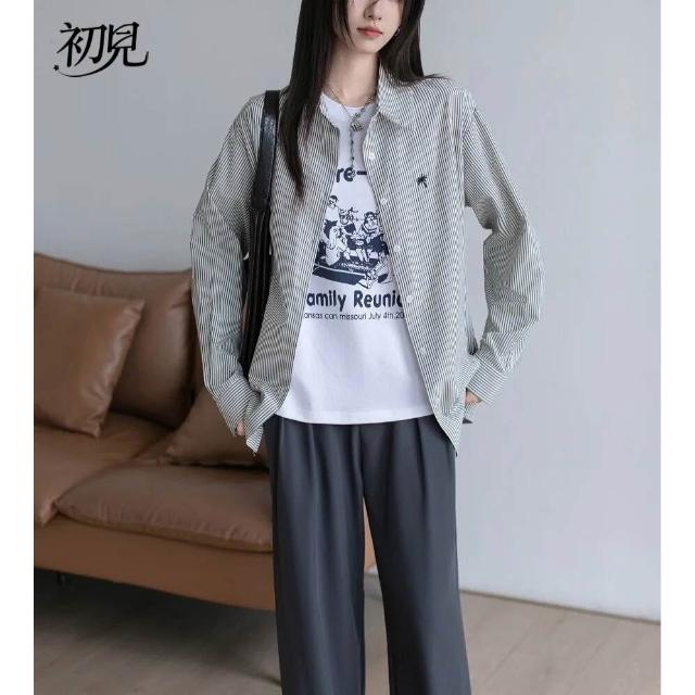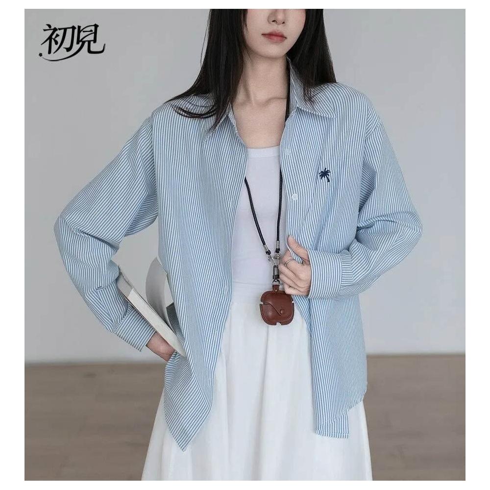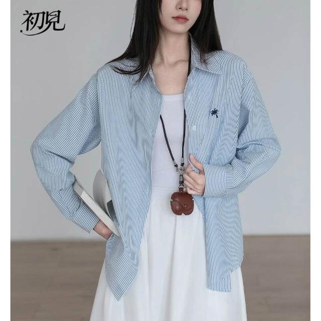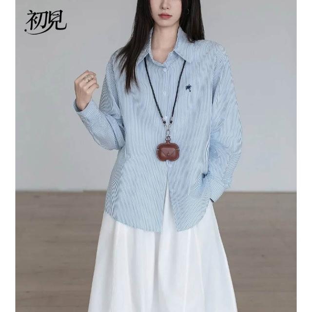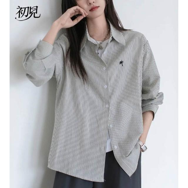 初見 短袖T恤 亞麻上衣 純棉T恤 真絲上衣 實拍戶外少女翻領撞色條紋襯衫微皺肌理感優雅刺繡長袖襯衣防曬服