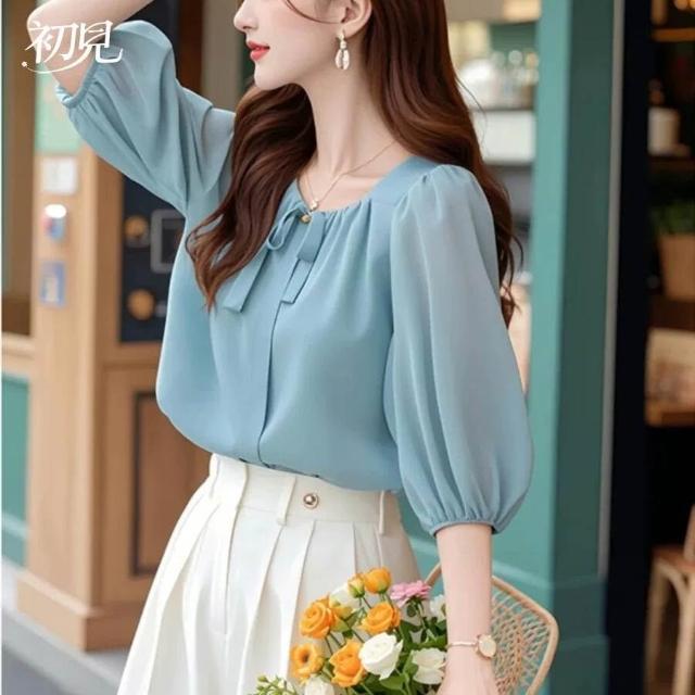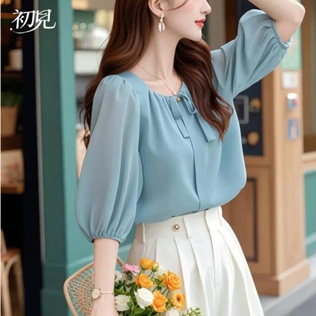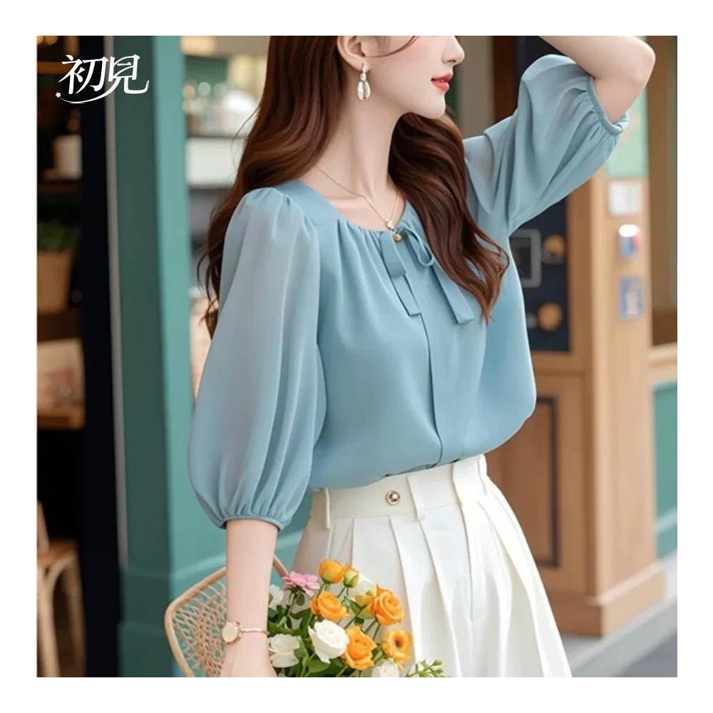 初見 短袖T恤 亞麻上衣 純棉T恤 真絲上衣 初秋減齡好看的韓系chic別致通勤上衣休閑藍色五分袖雪紡襯衫女款