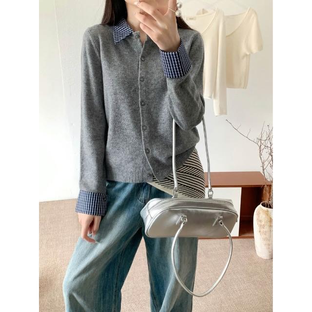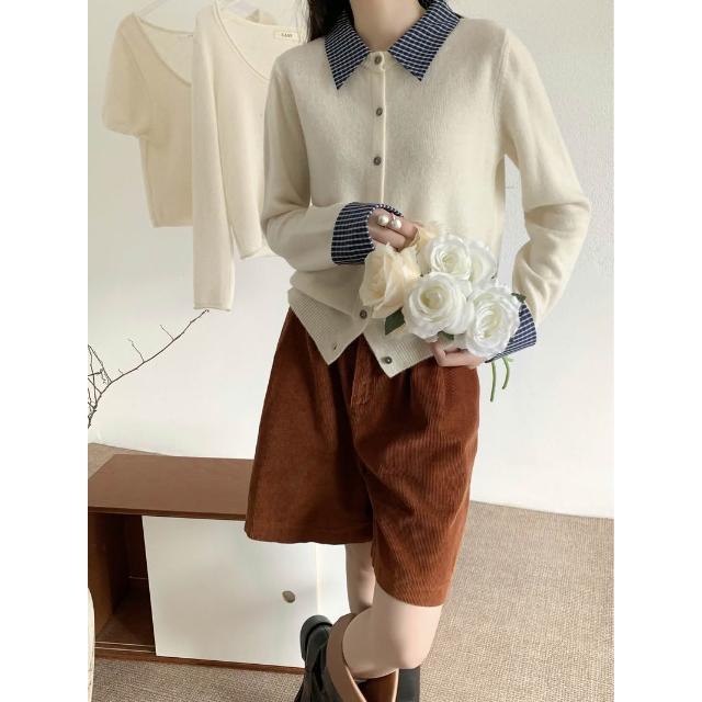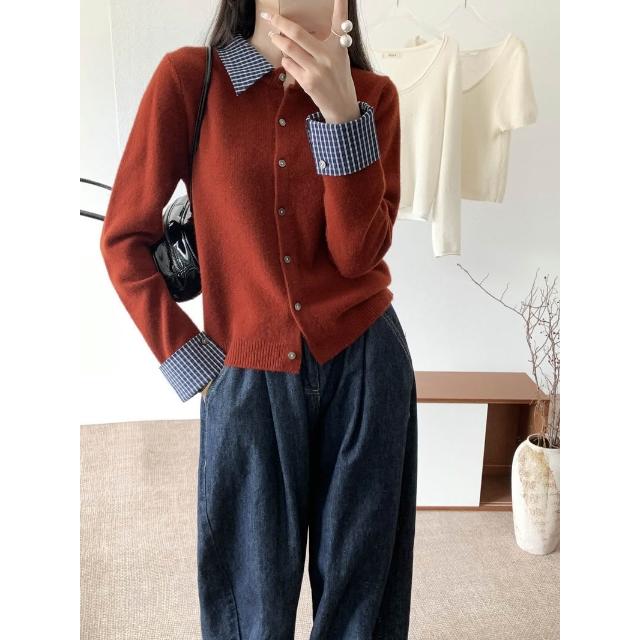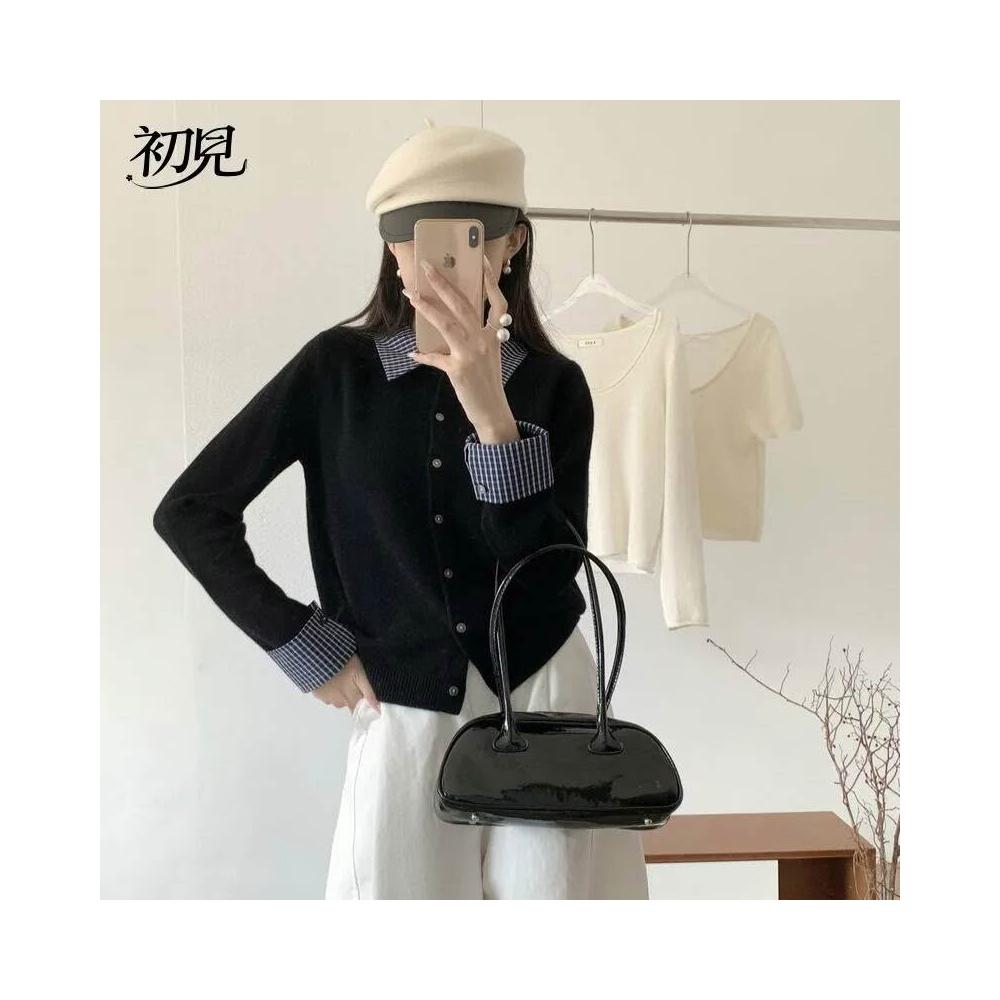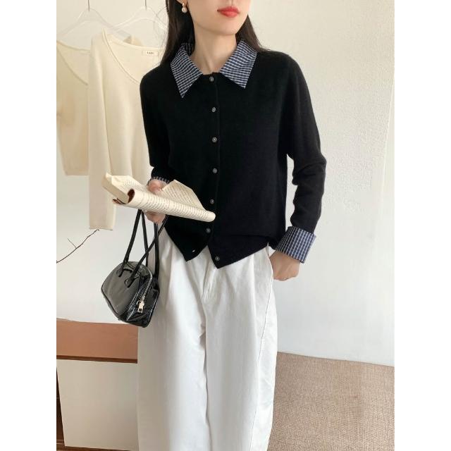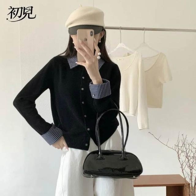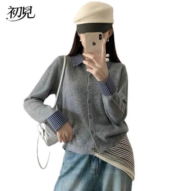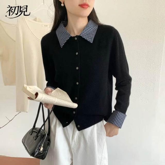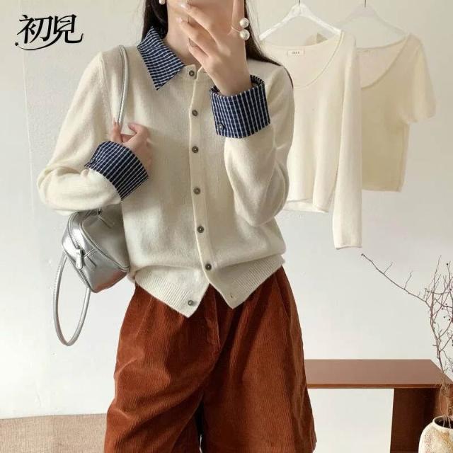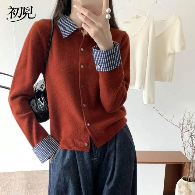 初見 短袖T恤 亞麻上衣 純棉T恤 真絲上衣 韓系羊毛衫女新款疊穿襯衫領假兩件通勤減齡針織衫毛衣