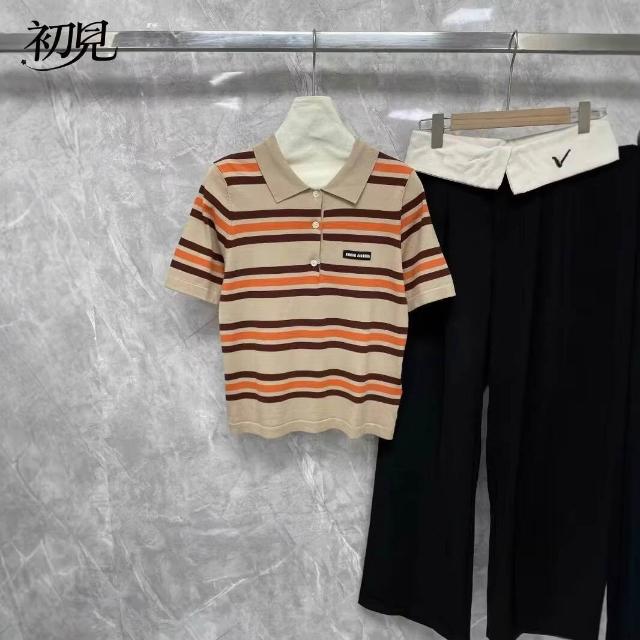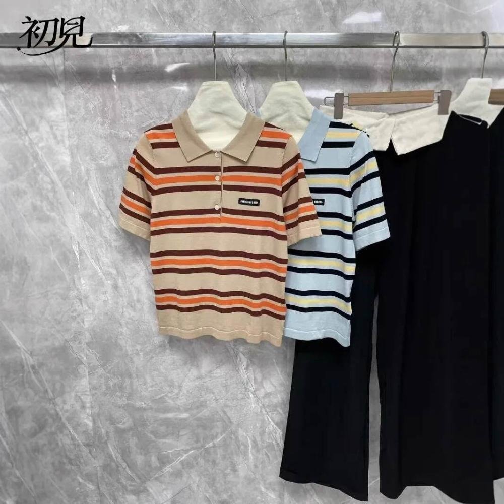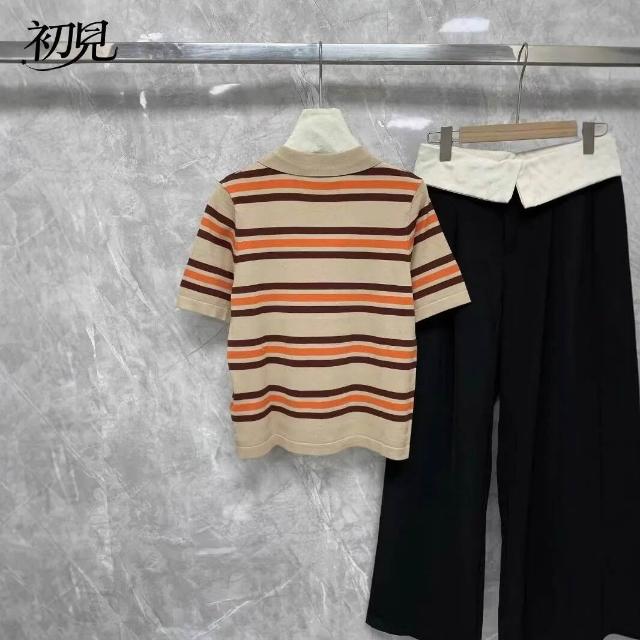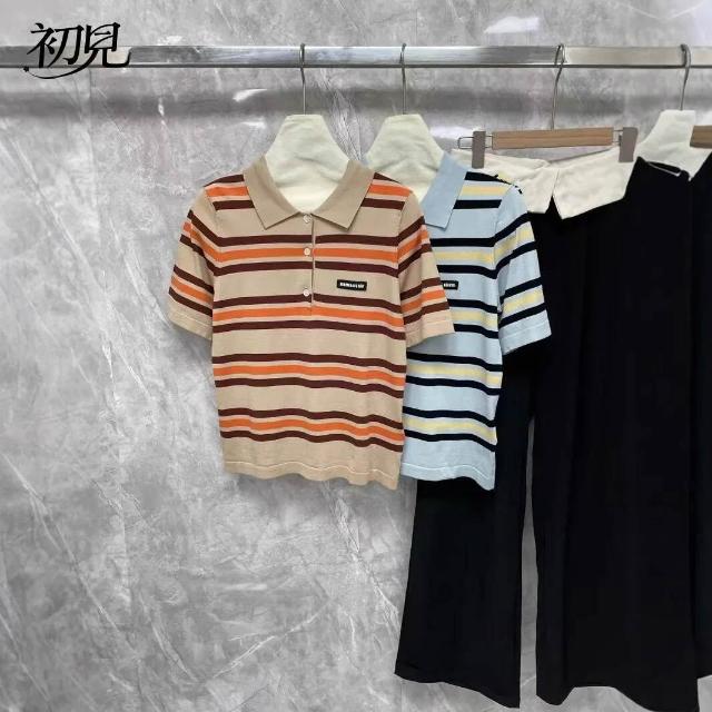 初見 短袖T恤 亞麻上衣 純棉T恤 真絲上衣 夏季新款女裝字母徽標貼布刺繡條紋針織短袖polo衫