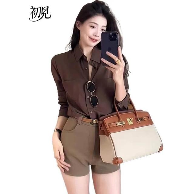 初見 短袖T恤 亞麻上衣 純棉T恤 真絲上衣 法式咖啡色襯衫女新款輕奢高級感早秋季長袖內搭疊穿襯衣上衣