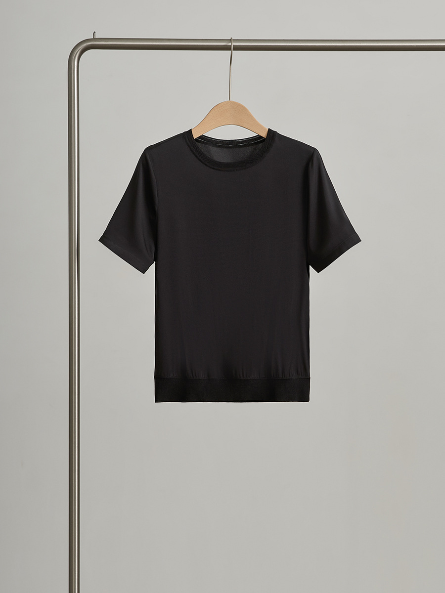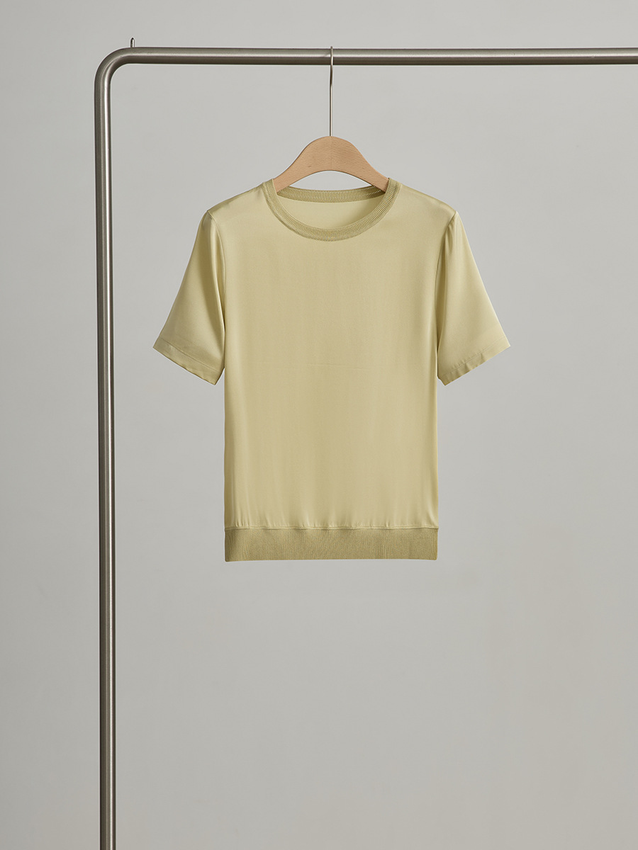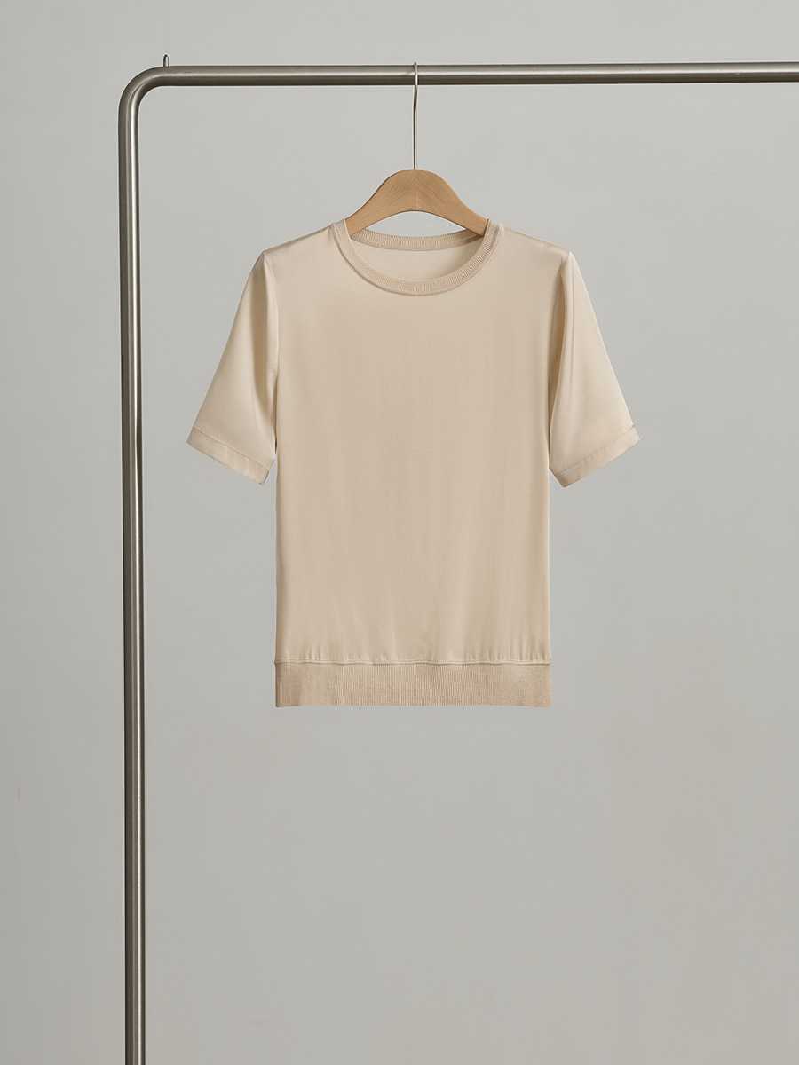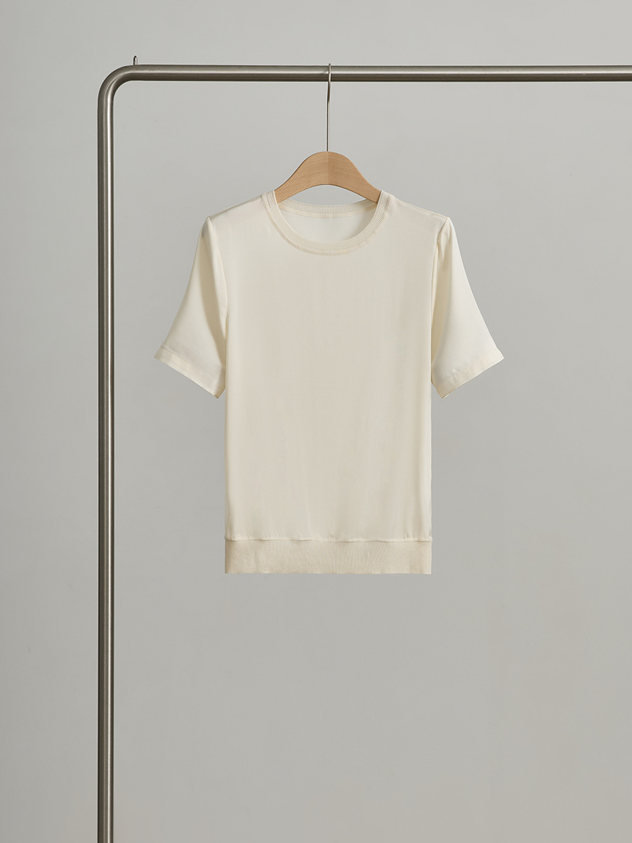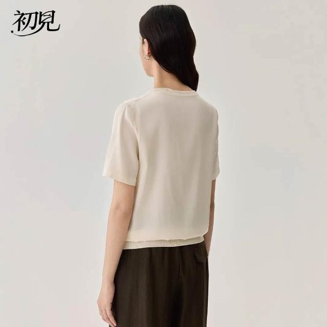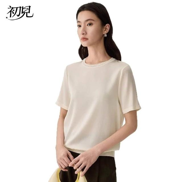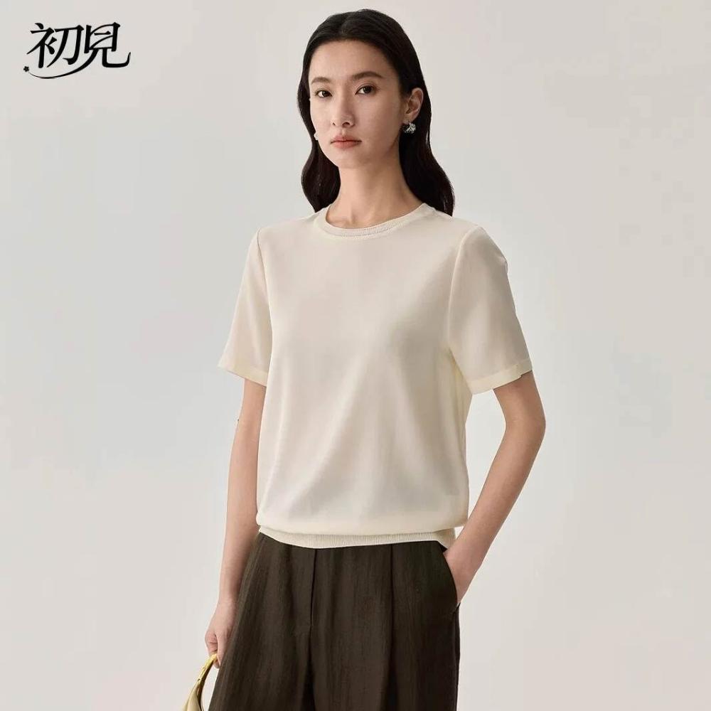 初見 短袖T恤 亞麻上衣 純棉T恤 真絲上衣 夏季桑蠶絲純色圓領簡約空氣T恤 真絲休閑基礎短袖上衣t恤女