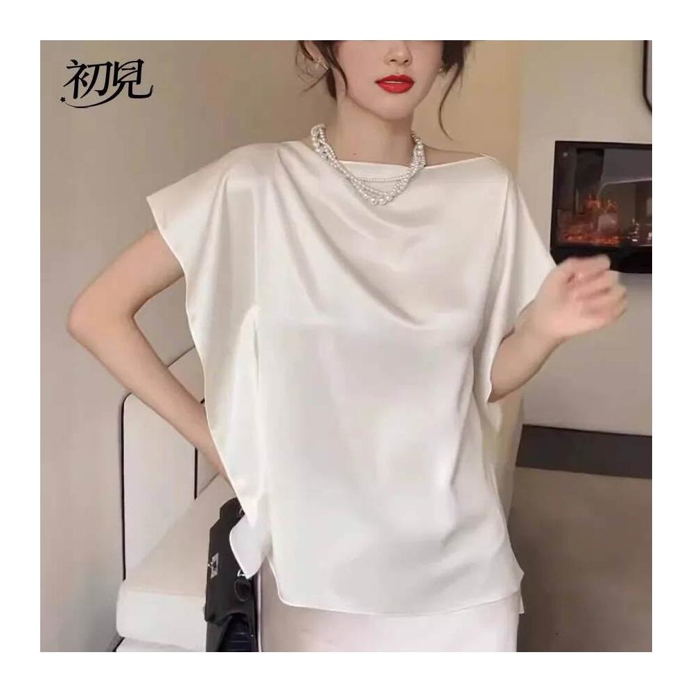 初見 短袖T恤 亞麻上衣 純棉T恤 真絲上衣 女真絲桑蠶絲t恤女夏季新款寬松蝙蝠袖短袖上衣