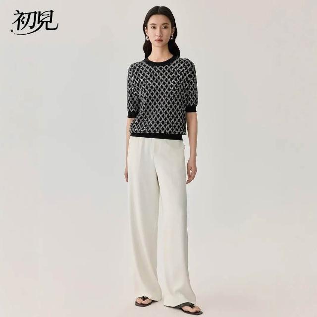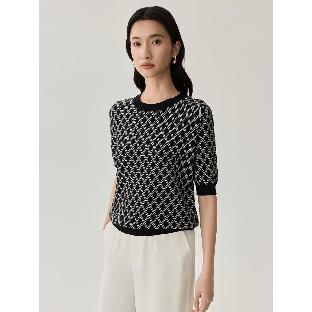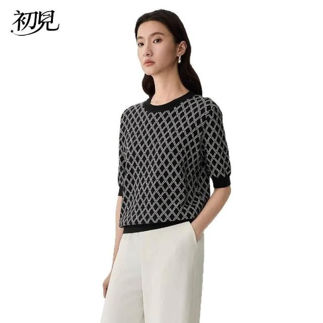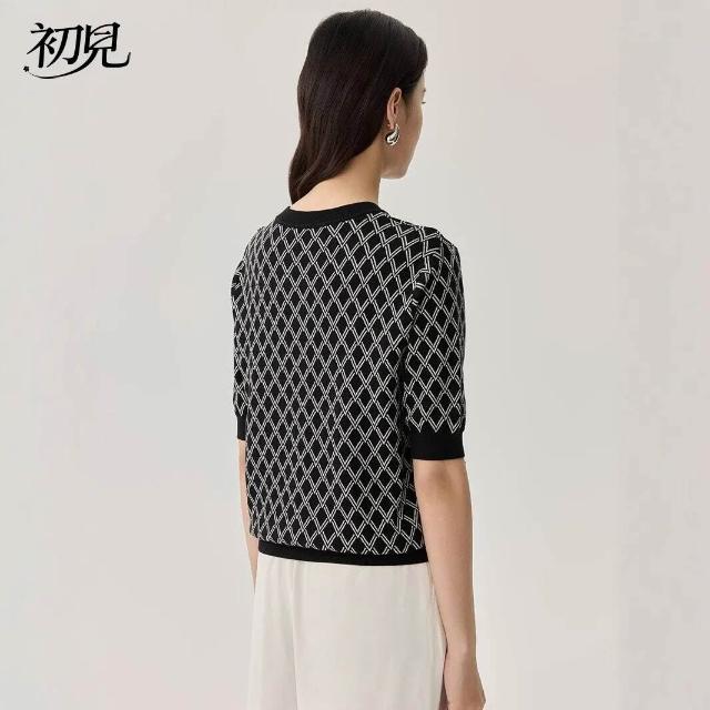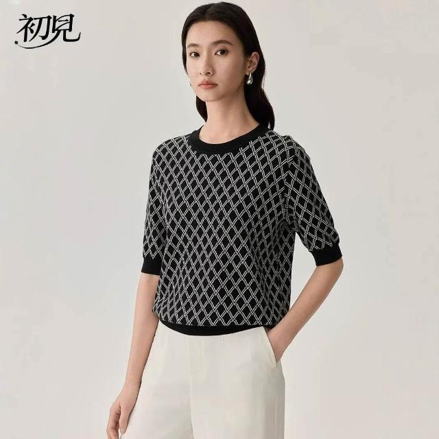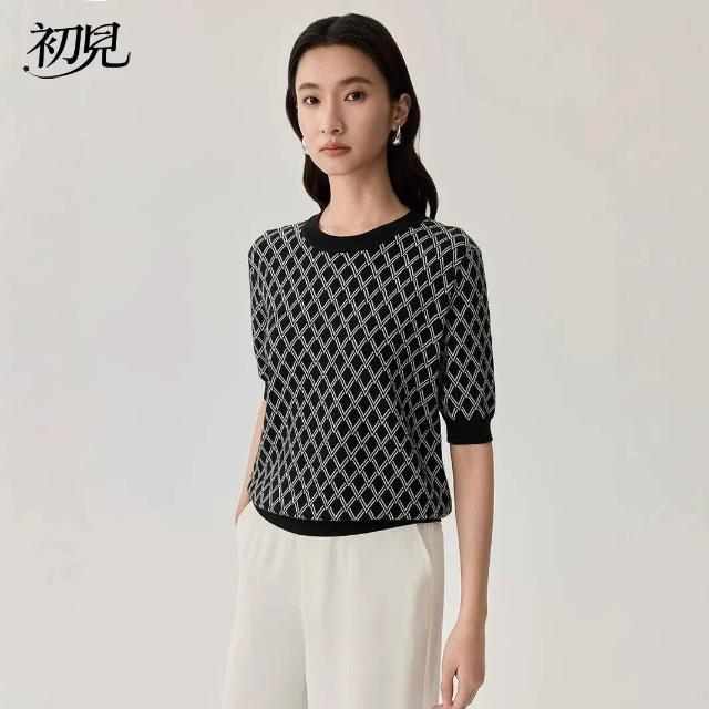 初見 短袖T恤 亞麻上衣 純棉T恤 真絲上衣 春夏新品桑蠶絲短袖女真絲黑白格紋T恤通勤撞色圓領套頭上衣