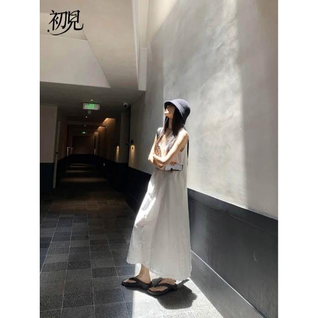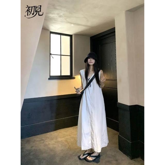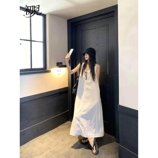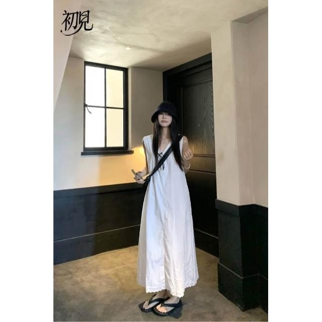 初見女裝 上衣 半身裙長裙 吊帶裙 連衣裙 v領背心連衣裙女夏季白色寬松顯瘦裙子慵懶休閑a字長裙